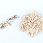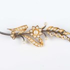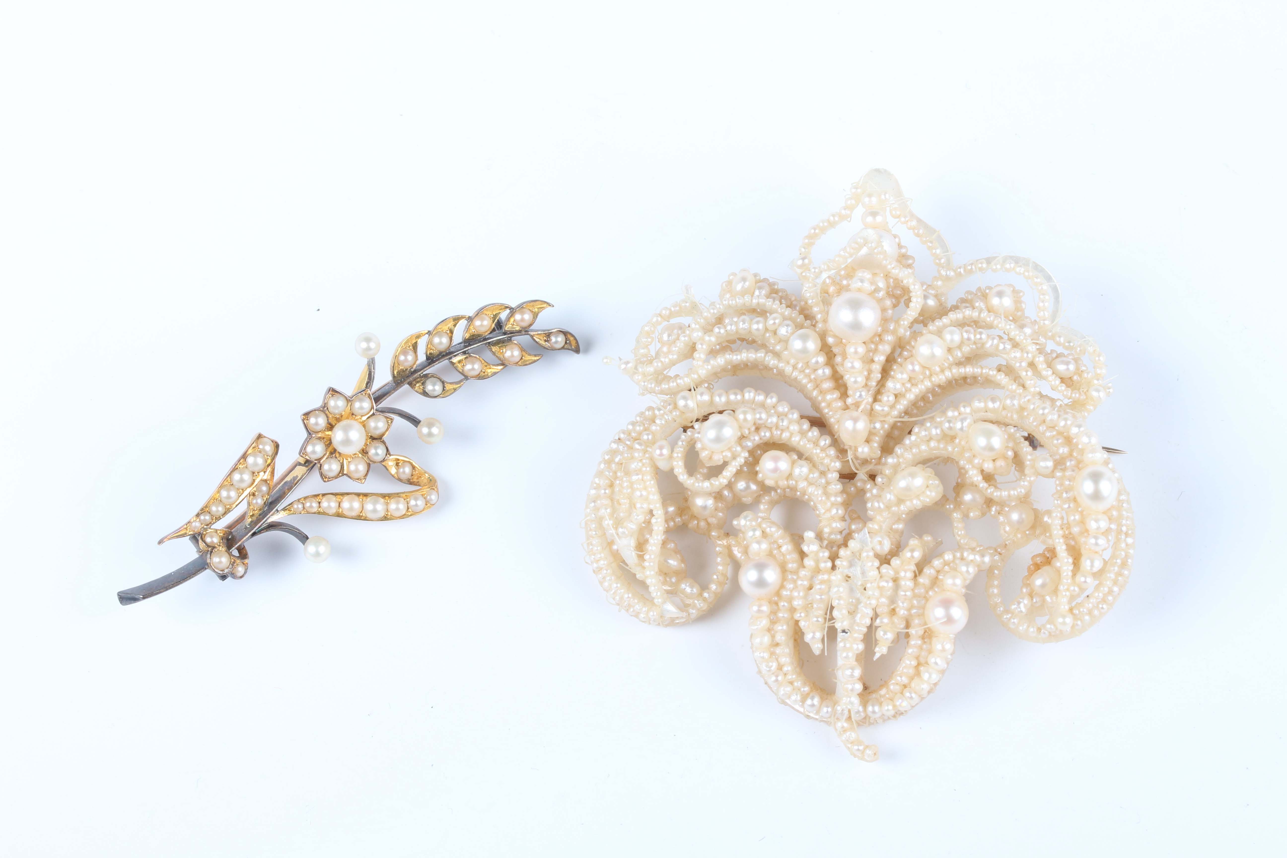 A gold and seed pearl brooch, designed as a foliate spray, unmarked, weight 6.9g, width 5.7cm, and a Victorian mother-of-pearl backed and seed pearl set brooch, designed as a flower, width 5.7cm (some seed pearls lacking).