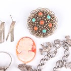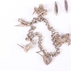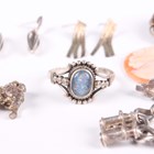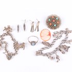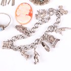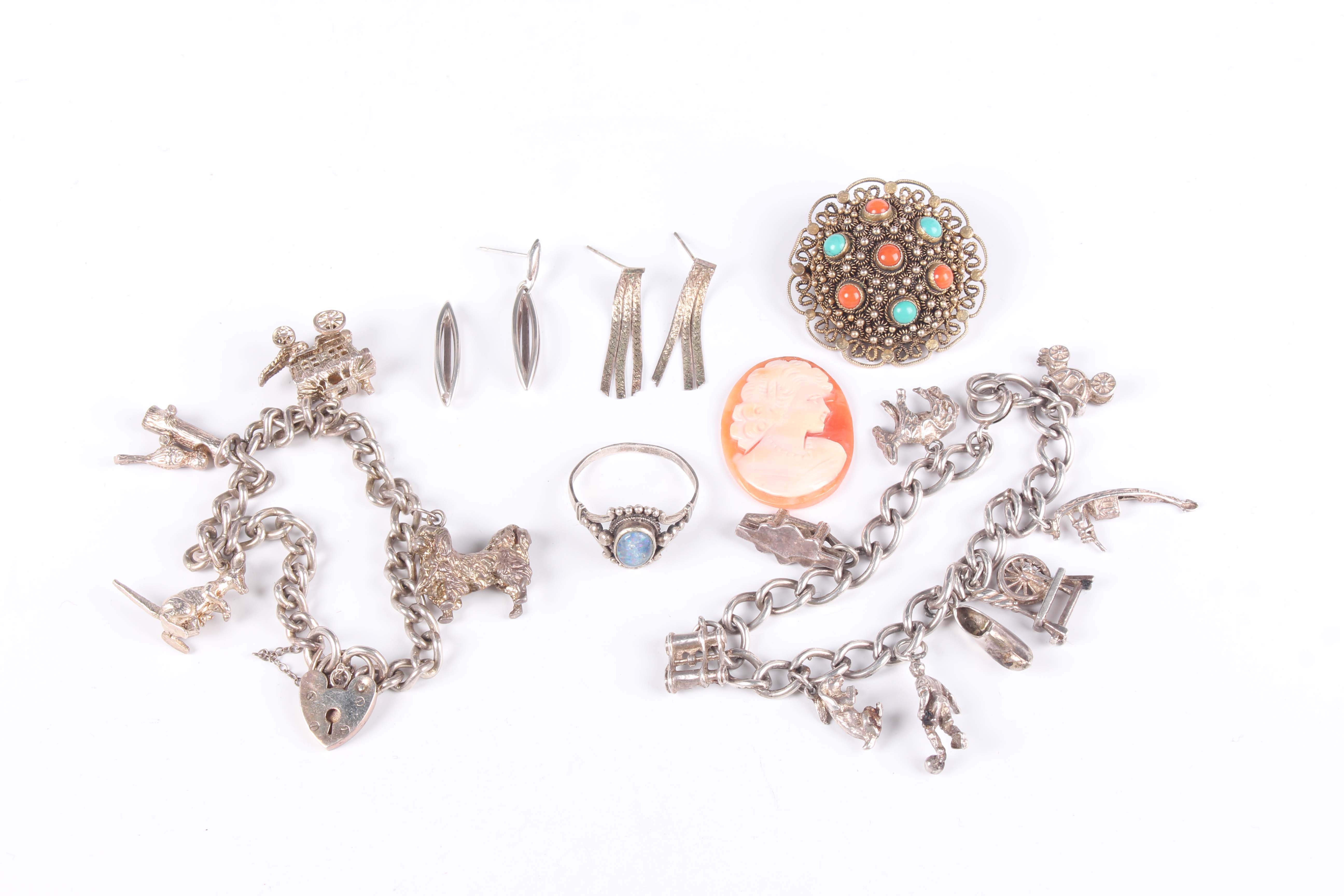 A small group of jewellery, comprising two silver curblink charm bracelets, total weight 67g, two pairs of silver earrings (one fitting lacking), a silver and opal triplet ring, an unmounted oval shell cameo and a silver gilt, coral and turquoise shaped circular brooch, detailed ‘Silver’.