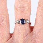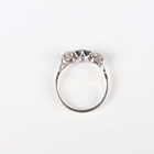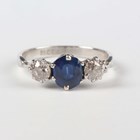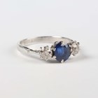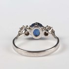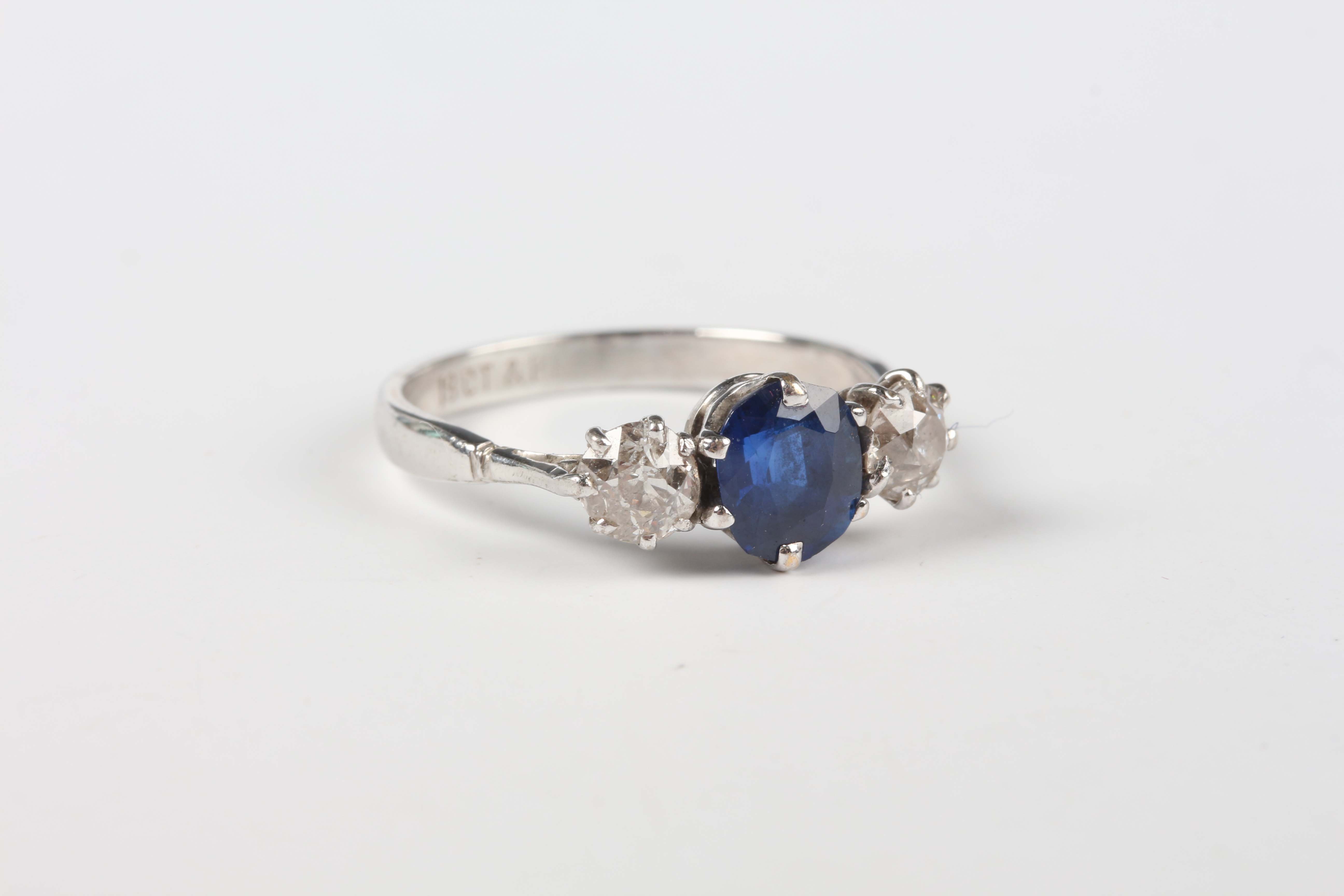 A white gold, platinum, sapphire and diamond ring, claw set with an oval cut sapphire between two old cut cushion shaped diamonds, detailed ‘18ct & Pla’, weight 2.5g, ring size approx M.
