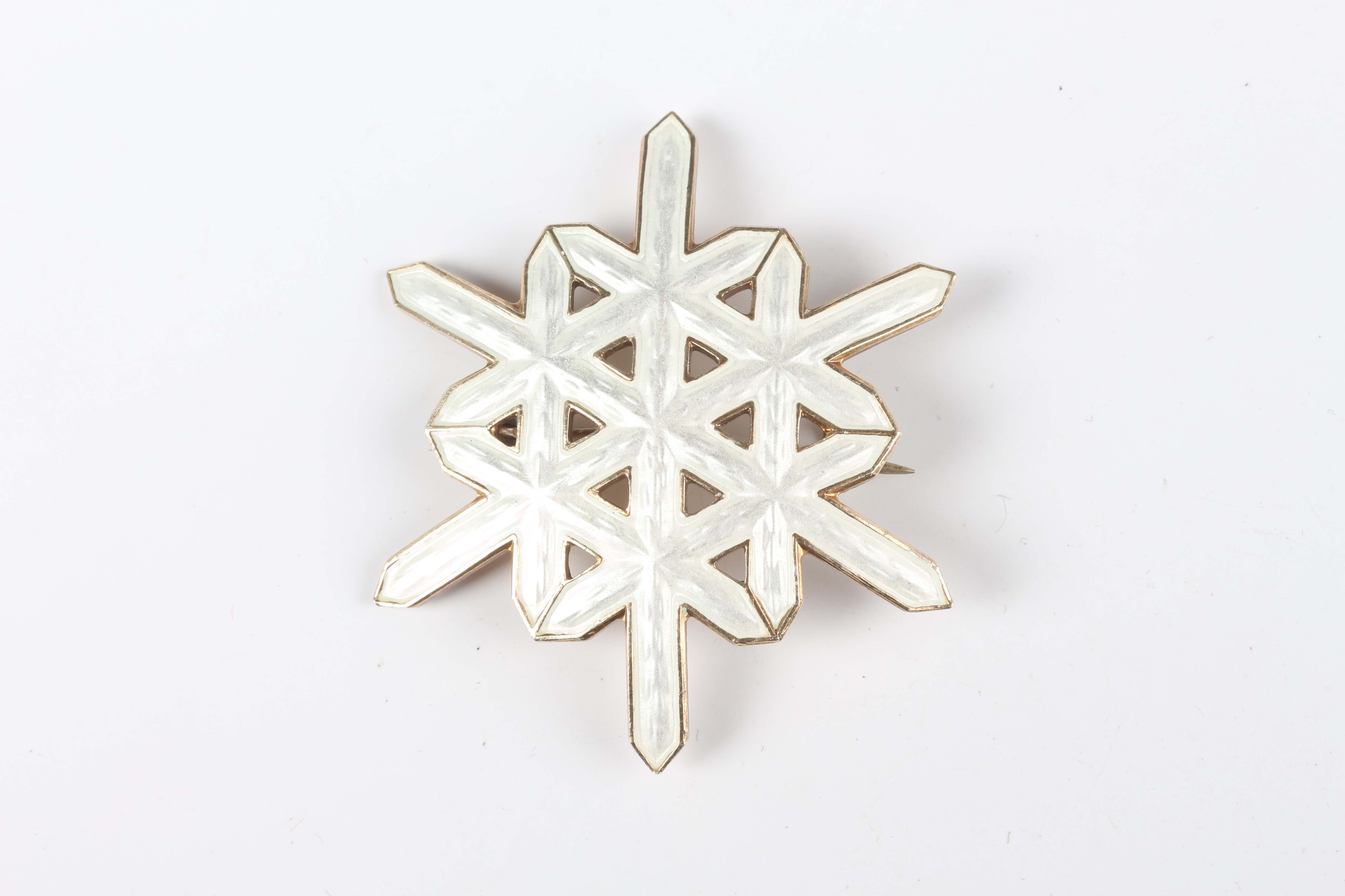 A Norwegian silver gilt and white enamelled brooch by Ottar Hval, designed as a snowflake, detailed ‘Sterling 925.S’, weight 8.8g, width 4.4cm.