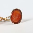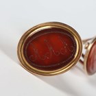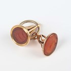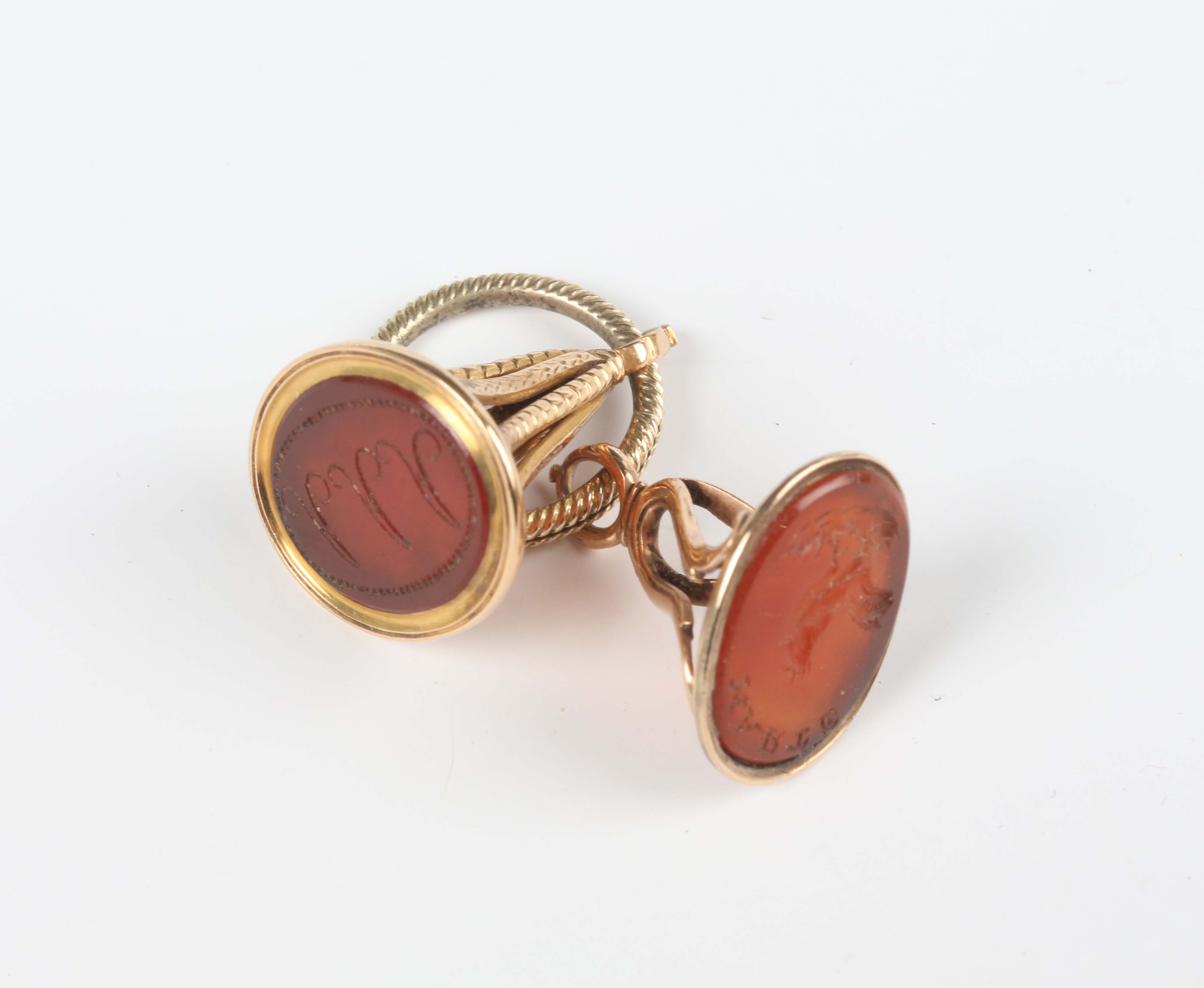 Two early 19th century gold mounted cornelian pendant fob seals, one engraved with the initials ‘AAA’, the other engraved with a cockerel below motto ‘Marte’, both unmarked, connected by a split ring, total weight 9.7g.