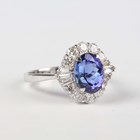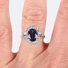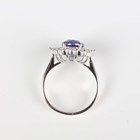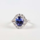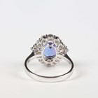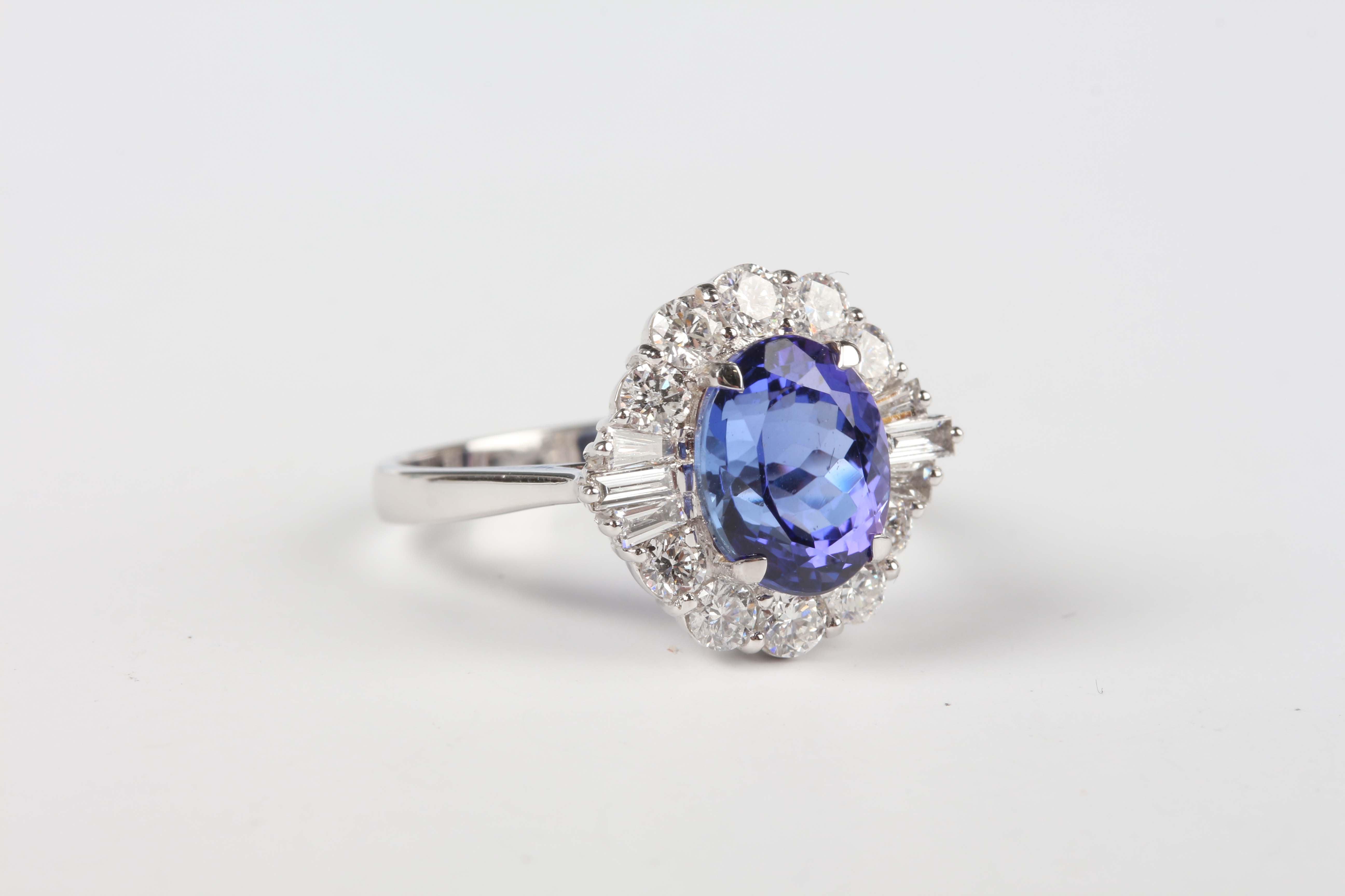 A white gold, tanzanite and diamond oval cluster ring, claw set with the oval mixed cut tanzanite within a surround of circular and tapered baguette cut diamonds, detailed ‘750’, weight 4.3g, tanzanite weight approx 3.00ct, ring size approx L1/2, with a World Gemological Institute report.