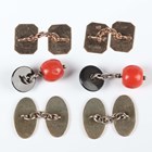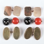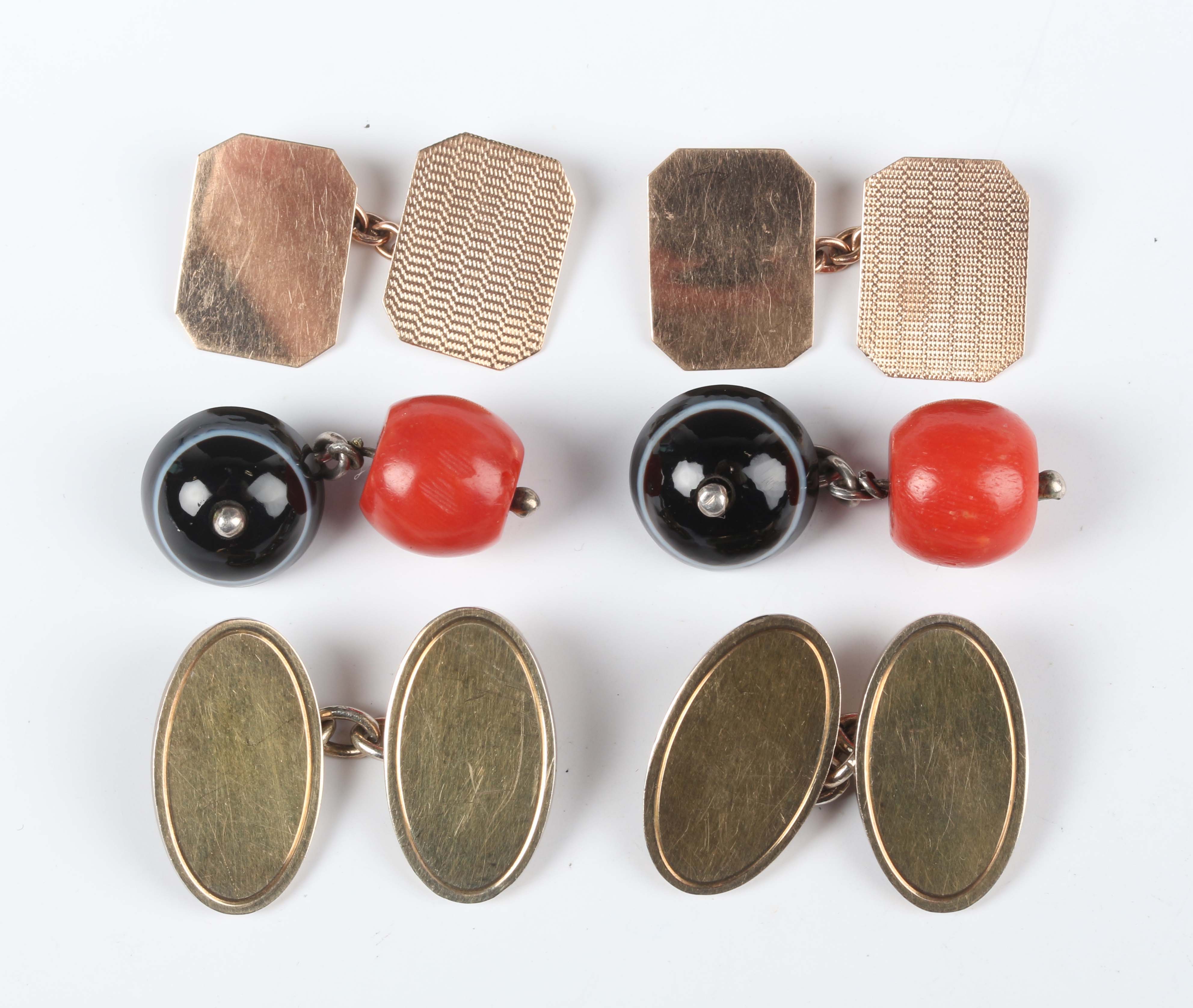 A pair of 9ct gold cut cornered rectangular cufflinks, engine turned to one side, Birmingham 1937, weight 3g, dimensions of each front 1.5cm x 1.1cm, a pair of gold on silver oval cufflinks, detailed ‘9ct on Silver’, weight 10.6g, and a pair of coral and banded agate cufflinks.