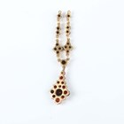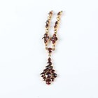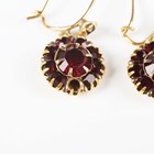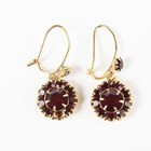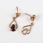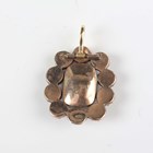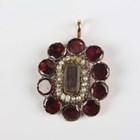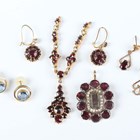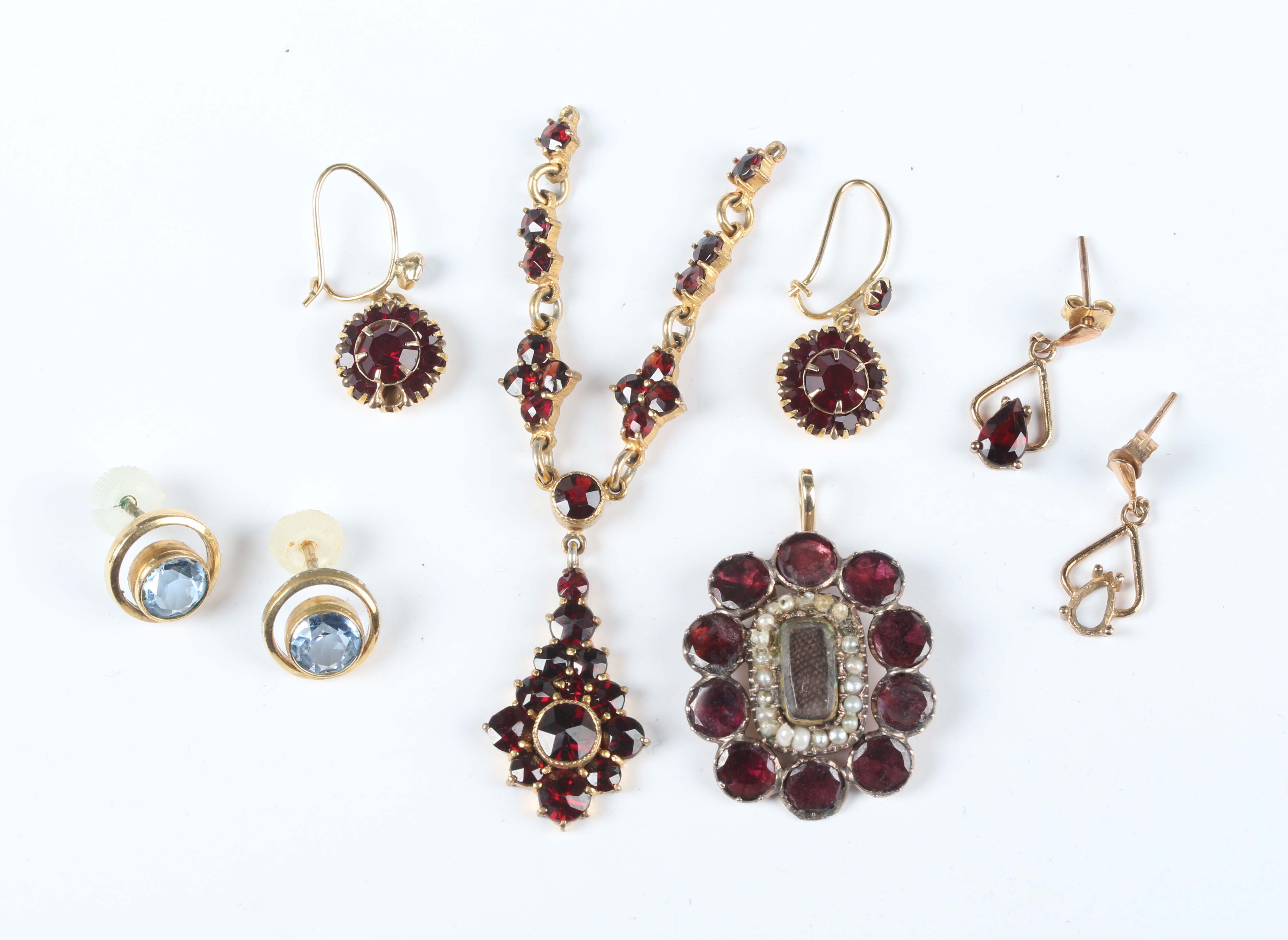 A Georgian foil-backed flat cut garnet and seed pearl brooch with a central glazed woven hair locket compartment, converted for wear as a pendant, length 2.9cm, a Bohemian garnet pendant and three pairs of earrings (one pear shaped garnet lacking from one earring).