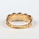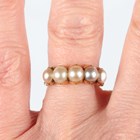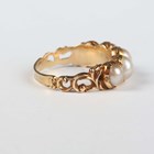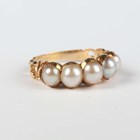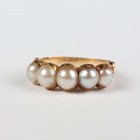 A Victorian gold and pearl ring, mounted with a row of five pearls, the shoulders with scroll pierced decoration, unmarked, weight 3.1g, ring size approx M.