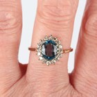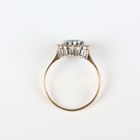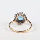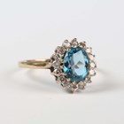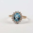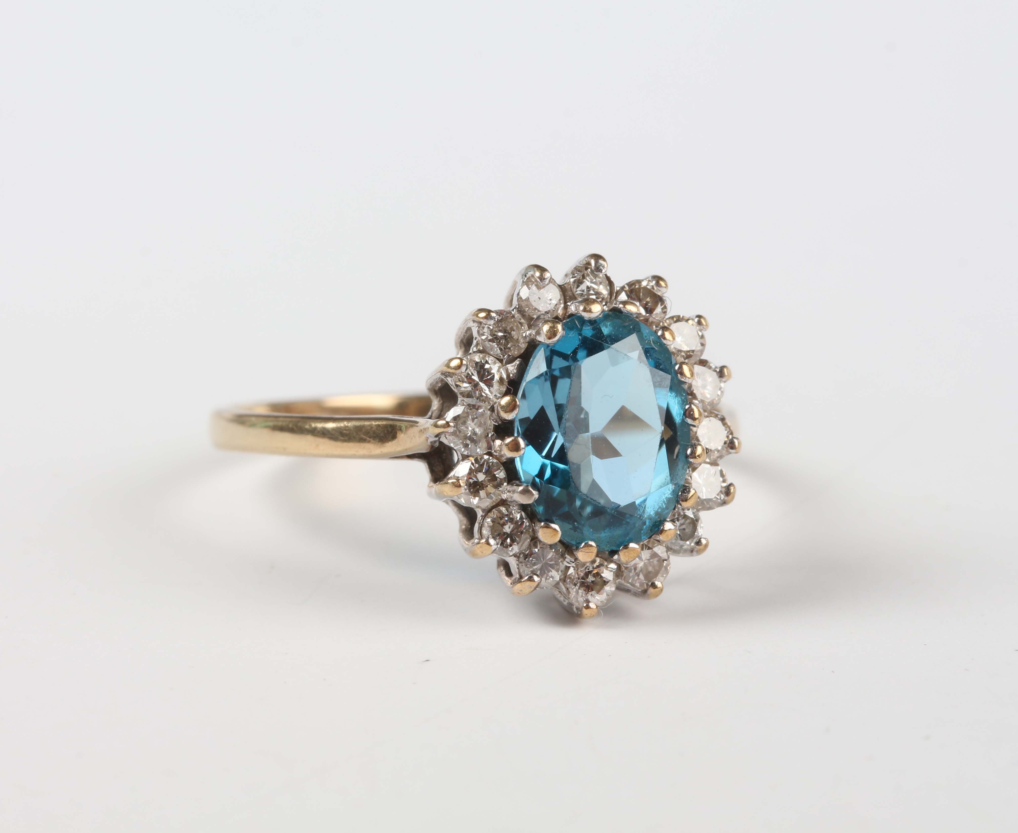 A 9ct gold ring, claw set with an oval cut blue topaz within a surround of circular cut diamonds, London 1990, weight 2.5g, ring size approx T.