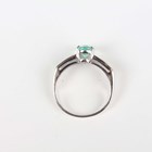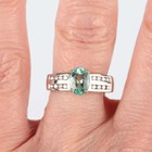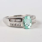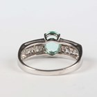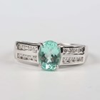 An 18ct white gold ring, claw set with an oval cut Paraiba tourmaline between diamond set sides, mounted with two rows of four circular cut diamonds to each side, weight 3.8g, ring size approx N.