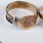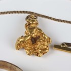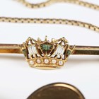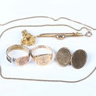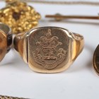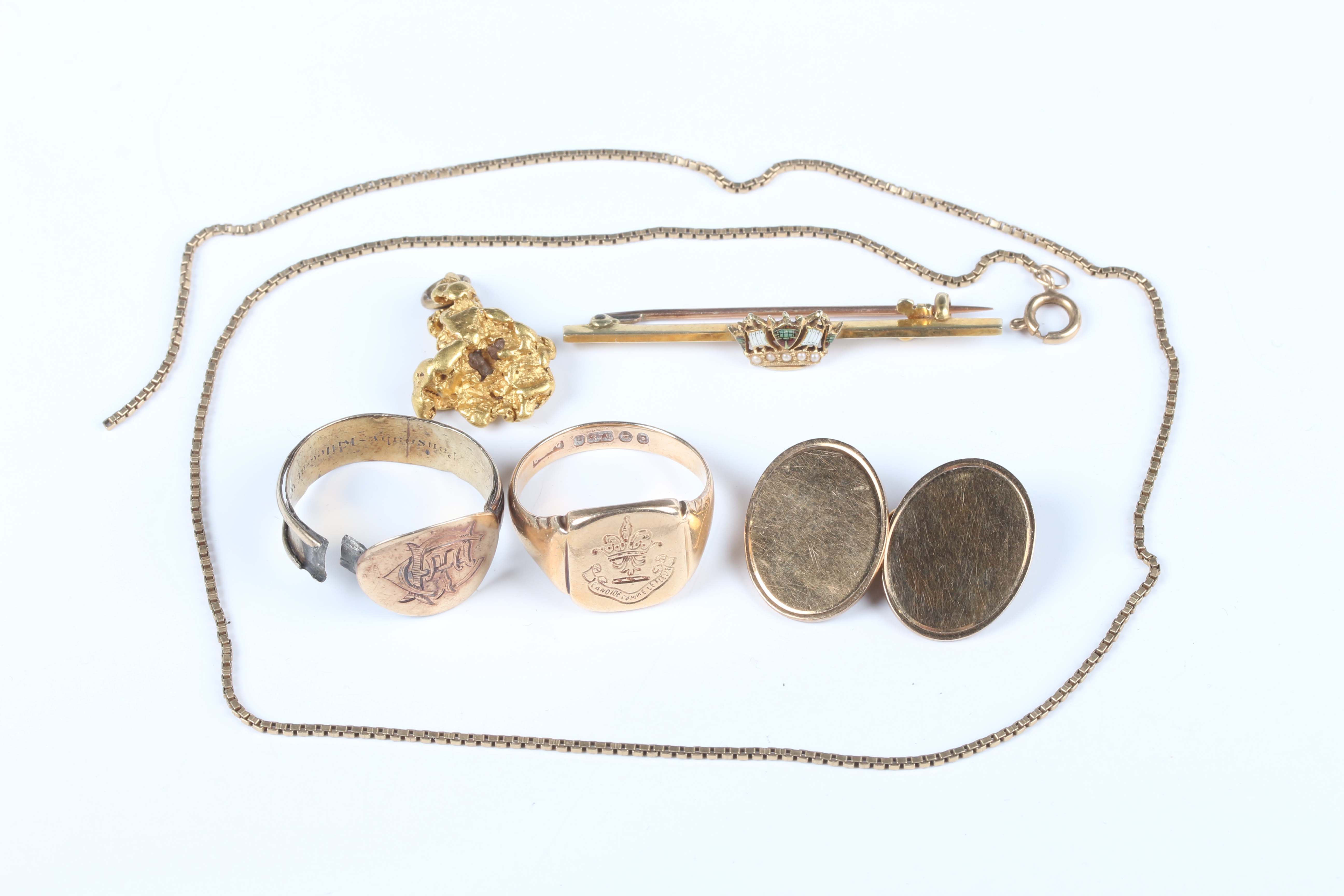 A 9ct gold signet ring with engraved crest and motto ‘Candide comme le fleur’ (Candid as the flower), London 1935, ring size approx O1/2, a 9ct gold oval cufflink, total weight 11.1g, a gold, seed pearl and enamelled bar brooch, the front applied with a naval crown motif, detailed ‘14C’, weight 2.5g, a gold nugget, weight 6.8g, a box link neckchain, unmarked, and another ring (shank split).