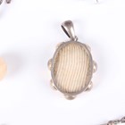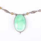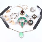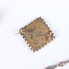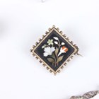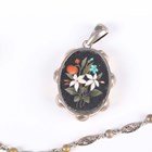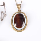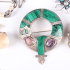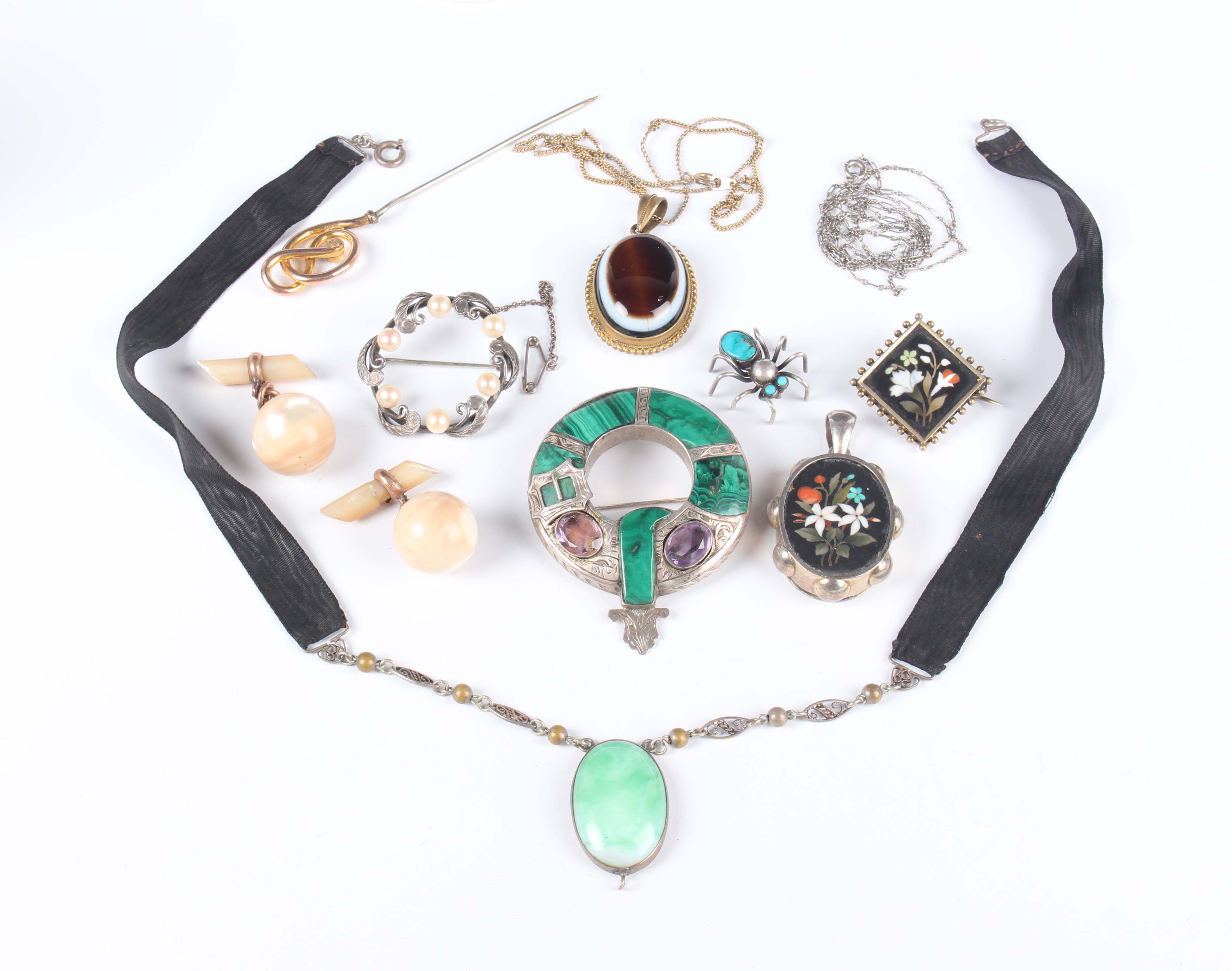 A small group of jewellery, including a gold topped and turquoise hat pin, detailed ‘9ct’, a pietre dure oval pendant locket, a similar brooch, detailed ‘900’, a Scottish malachite and amethyst pendant brooch and a Cartier rectangular case.