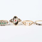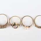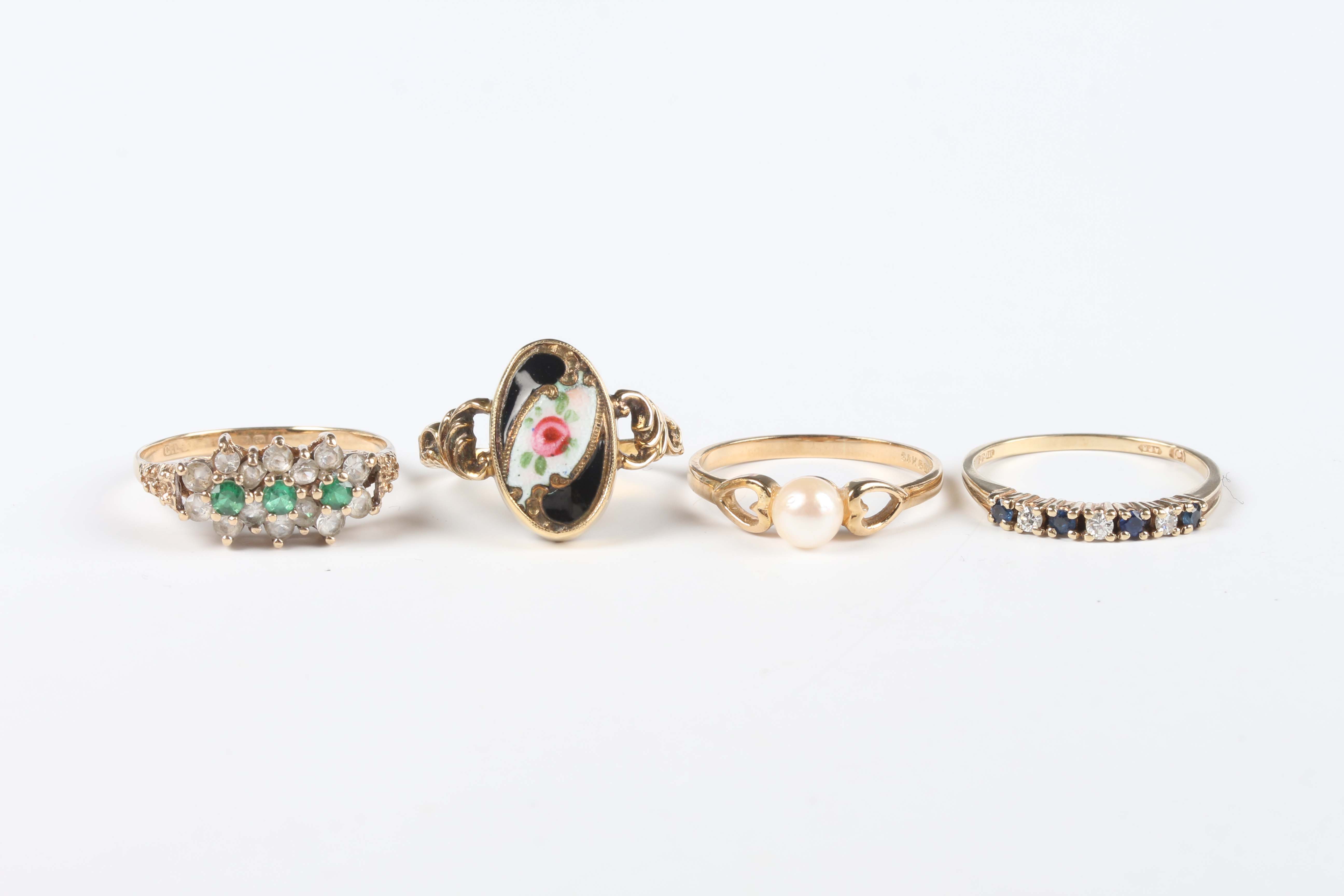 A gold and enamelled oval ring with a flower motif, detailed ‘9ct’, ring size approx I1/2, a 9ct gold, sapphire and diamond seven stone ring, mounted with alternating sapphires and diamonds, ring size approx N1/2, a 9ct gold ring, mounted with a cultured pearl, and a 9ct gold, green and colourless gem set ring, total weight 7.1g.