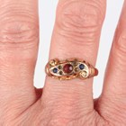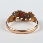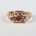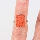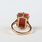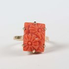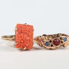 A gold ring, mounted with a rectangular coral, carved with floral decoration, unmarked, weight 3.5g, ring size approx F1/2, and a 9ct gold and paste set ring in a twistover design, Chester 1925, weight 2.2g, ring size approx S1/2 (three pastes lacking).
