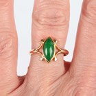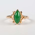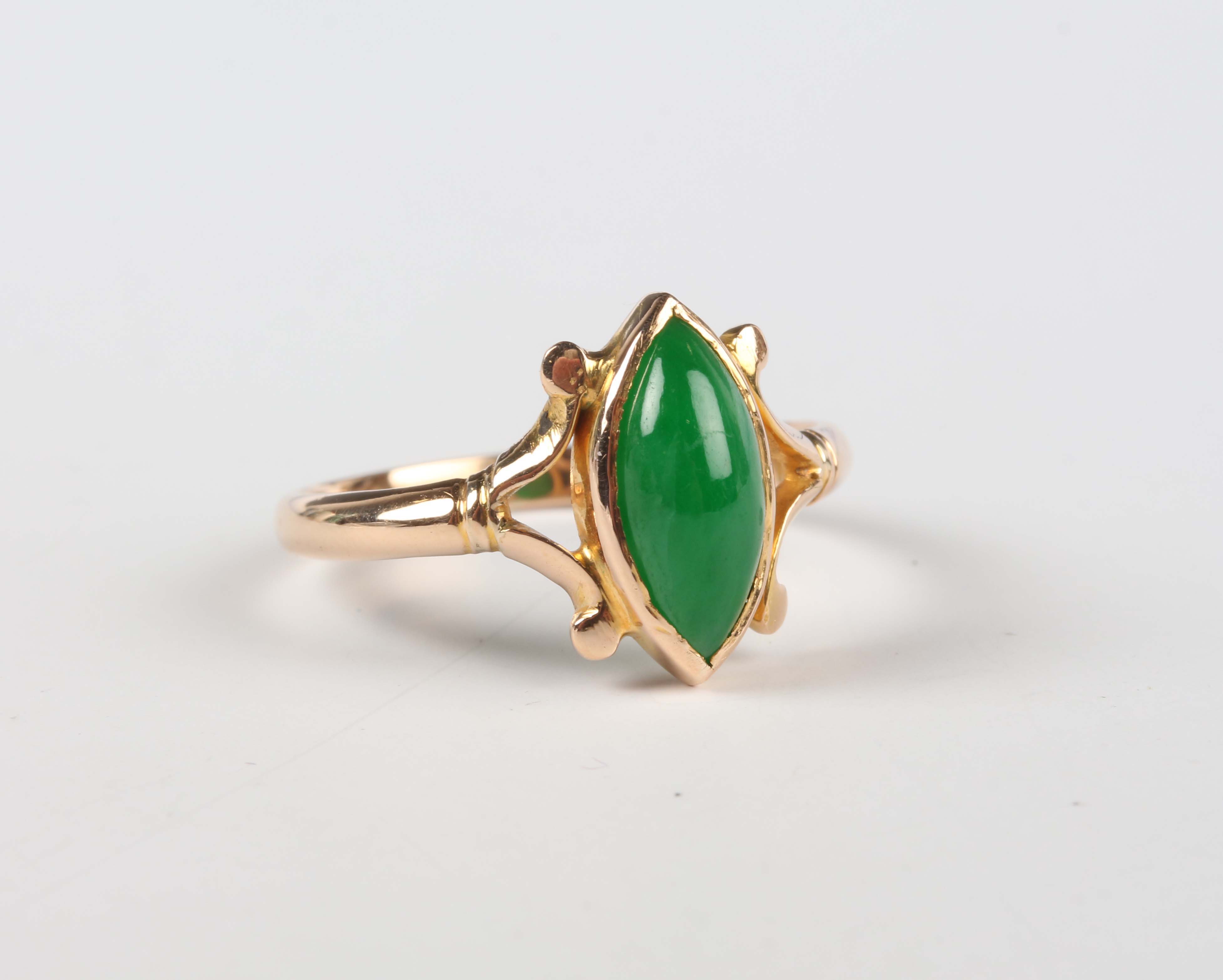 An Asian gold ring, mounted with a marquise shaped jade between scroll pierced shoulders, detailed ‘18’, weight 2.5g, ring size approx N1/2.