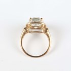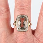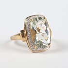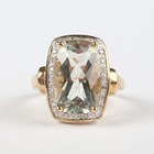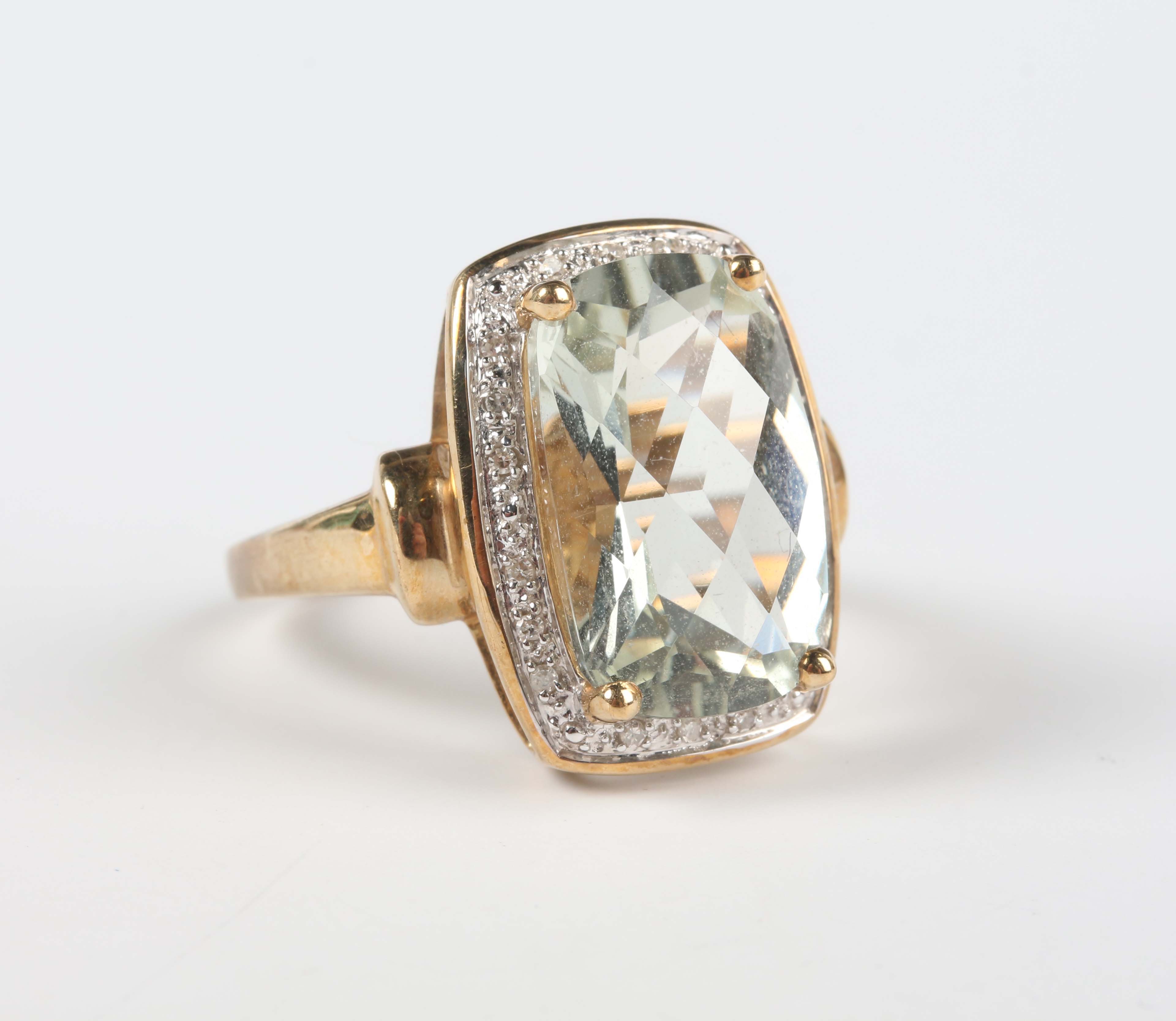 A 9ct gold, prasiolite and diamond ring, claw set with the cushion shaped prasiolite within a surround of circular cut diamonds, Birmingham 2007, weight 5.2g, ring size approx P1/2.