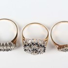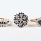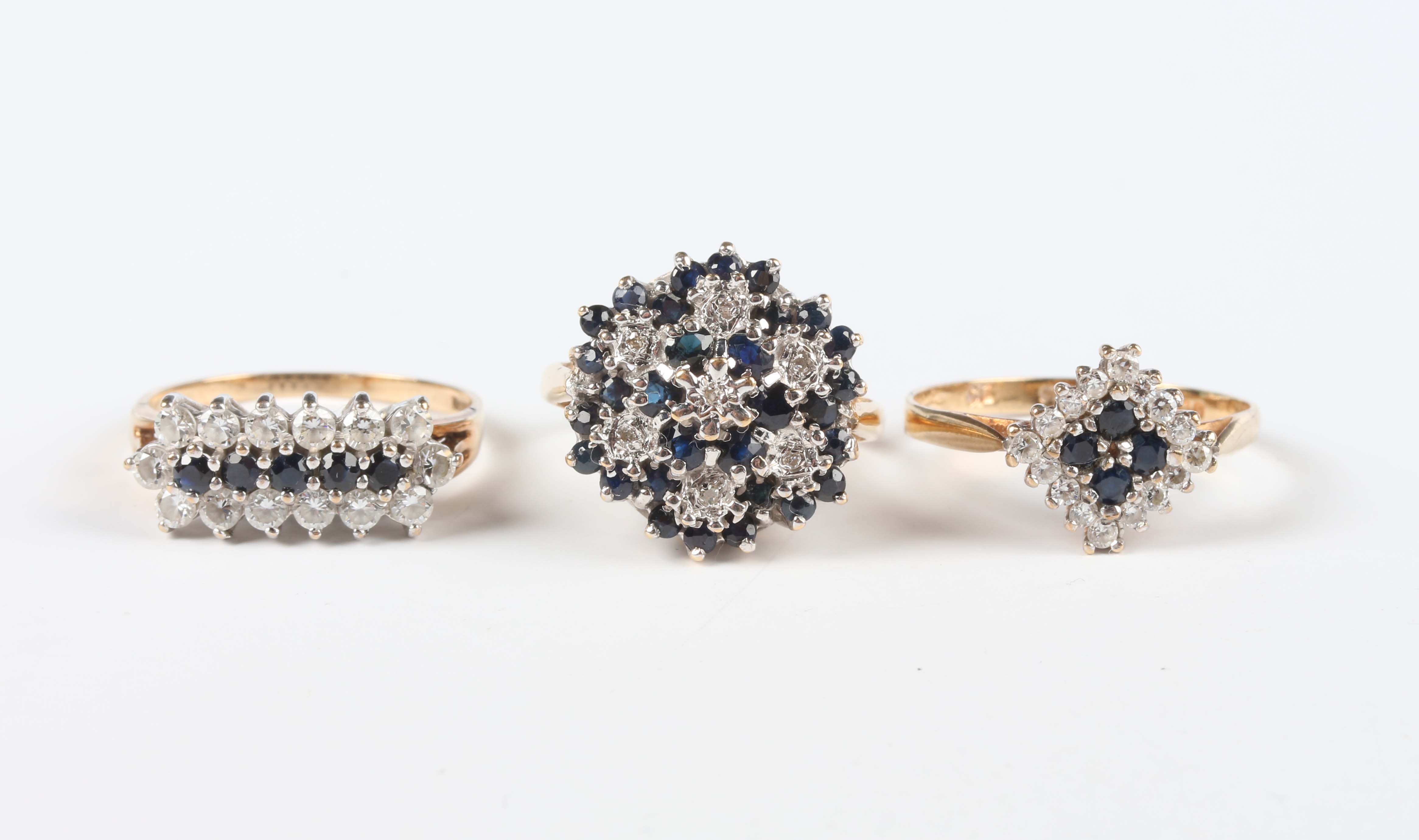 An 18ct gold, sapphire and diamond hexagonal cluster ring, weight 5.1g, ring size approx K, a 9ct gold ring, mounted with a row of five circular cut sapphires within a colourless gem set surround, ring size approx P, and a 9ct gold, sapphire and colourless gem set square cluster ring, total weight 4.6g.