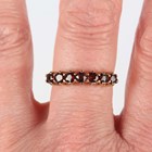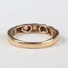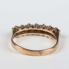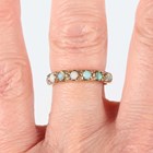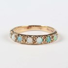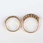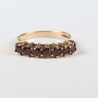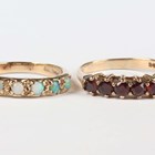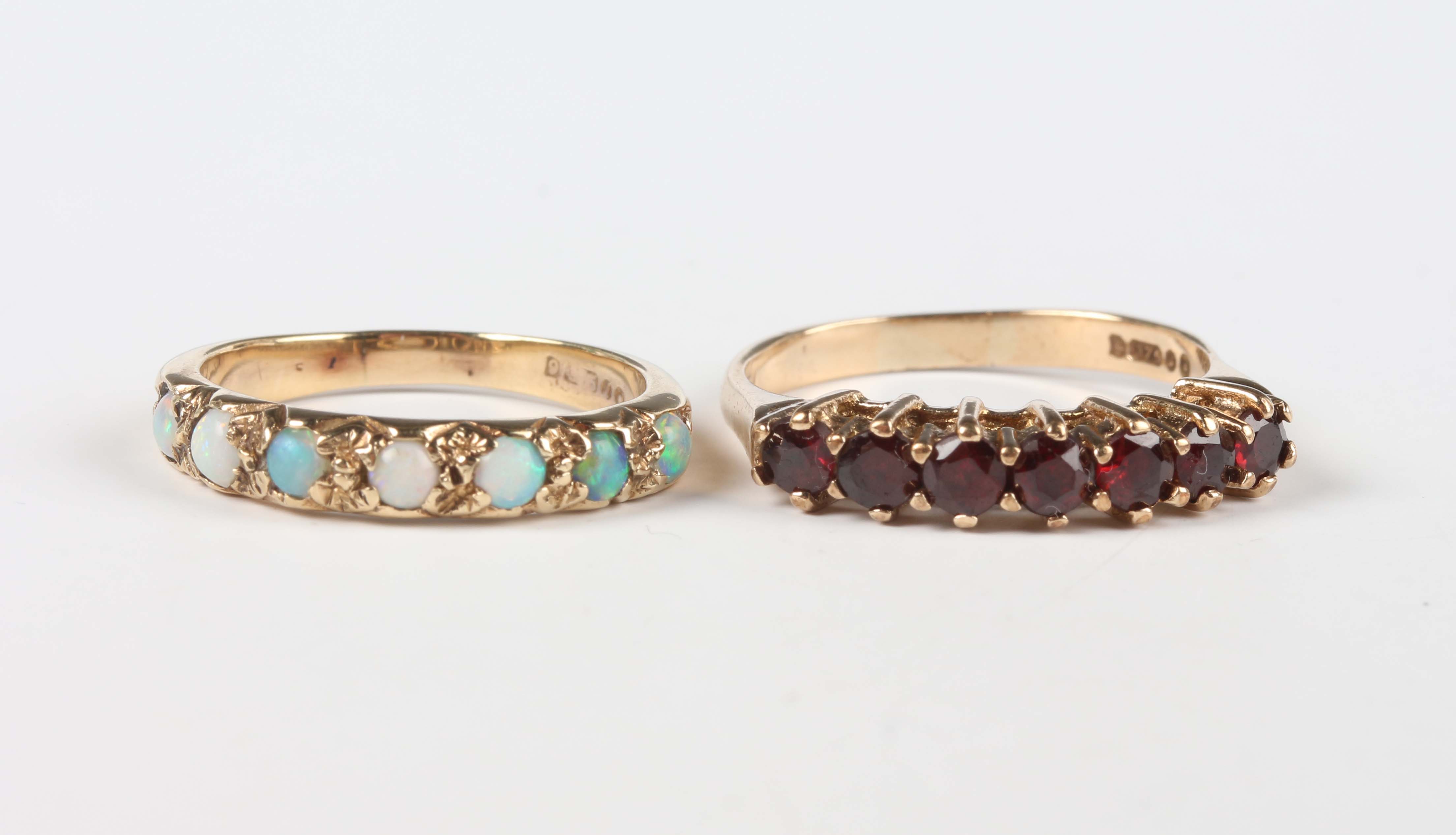 A 9ct gold and opal seven stone ring, mounted with a row of circular opals, London 1964, ring size approx N, and a 9ct gold and garnet seven stone ring, mounted with circular cut garnets, ring size approx Q, total weight 5.1g.