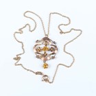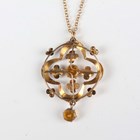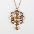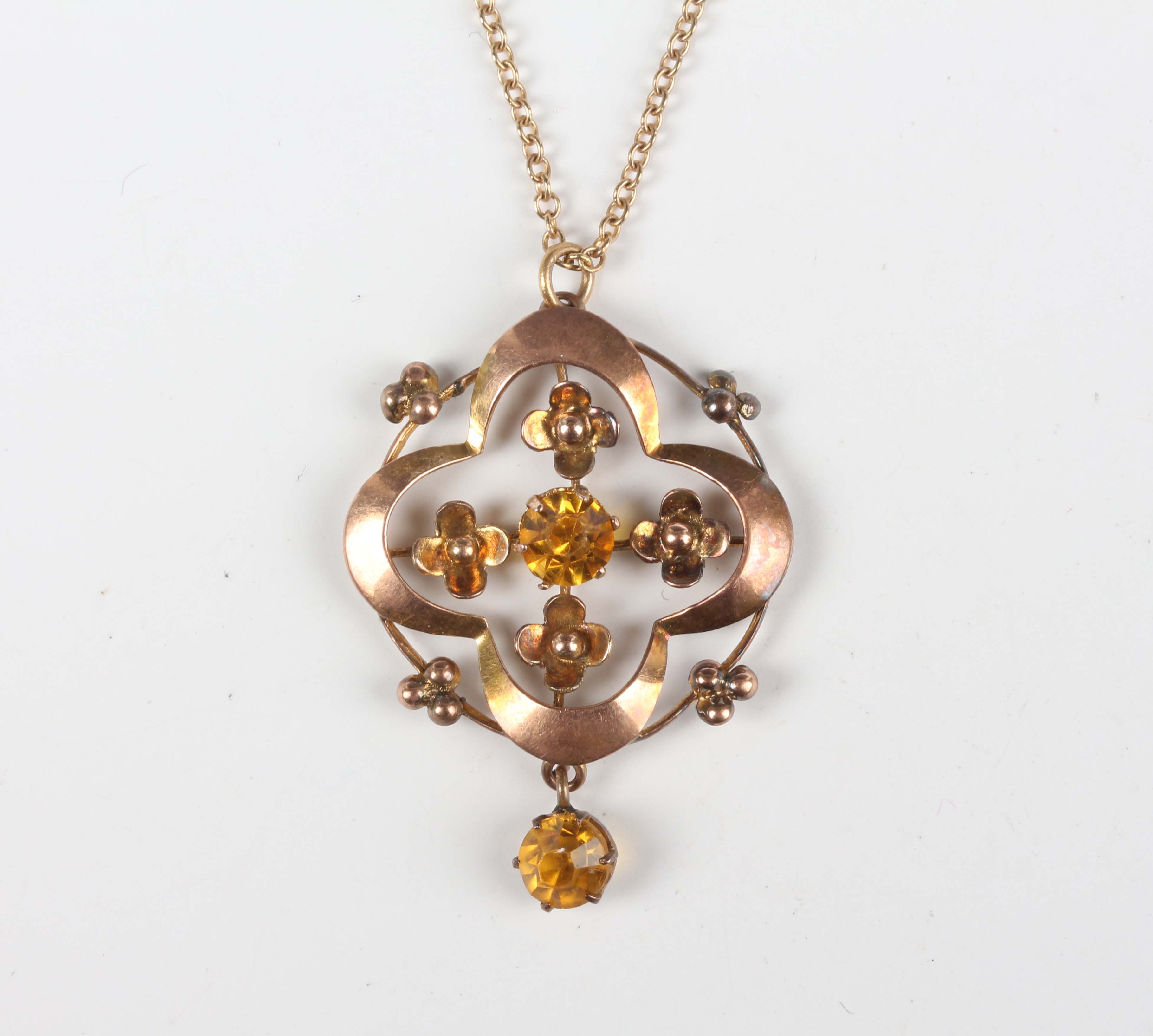 An Edwardian gold and orange paste pendant of foliate form, detailed ‘9ct’, length 3.4cm, with a 9ct gold oval link neckchain on a boltring clasp, detailed ‘9ct’, length 41.2cm, total weight 3.6g.