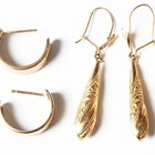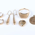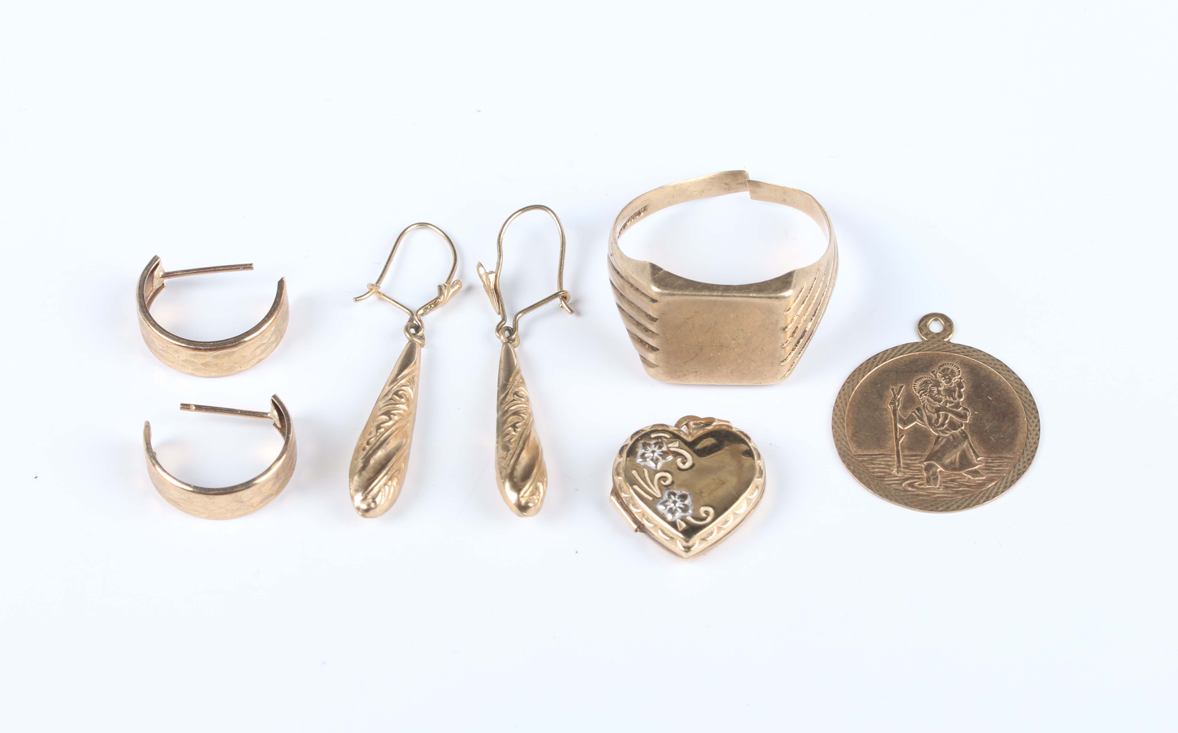 A 9ct gold rectangular signet ring (shank cut), a 9ct gold St Christopher pendant, total weight 6.6g, a pair of half hoop earrings, a pair of pendant earrings and a heart shaped pendant locket, all unmarked.
