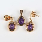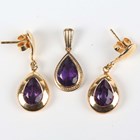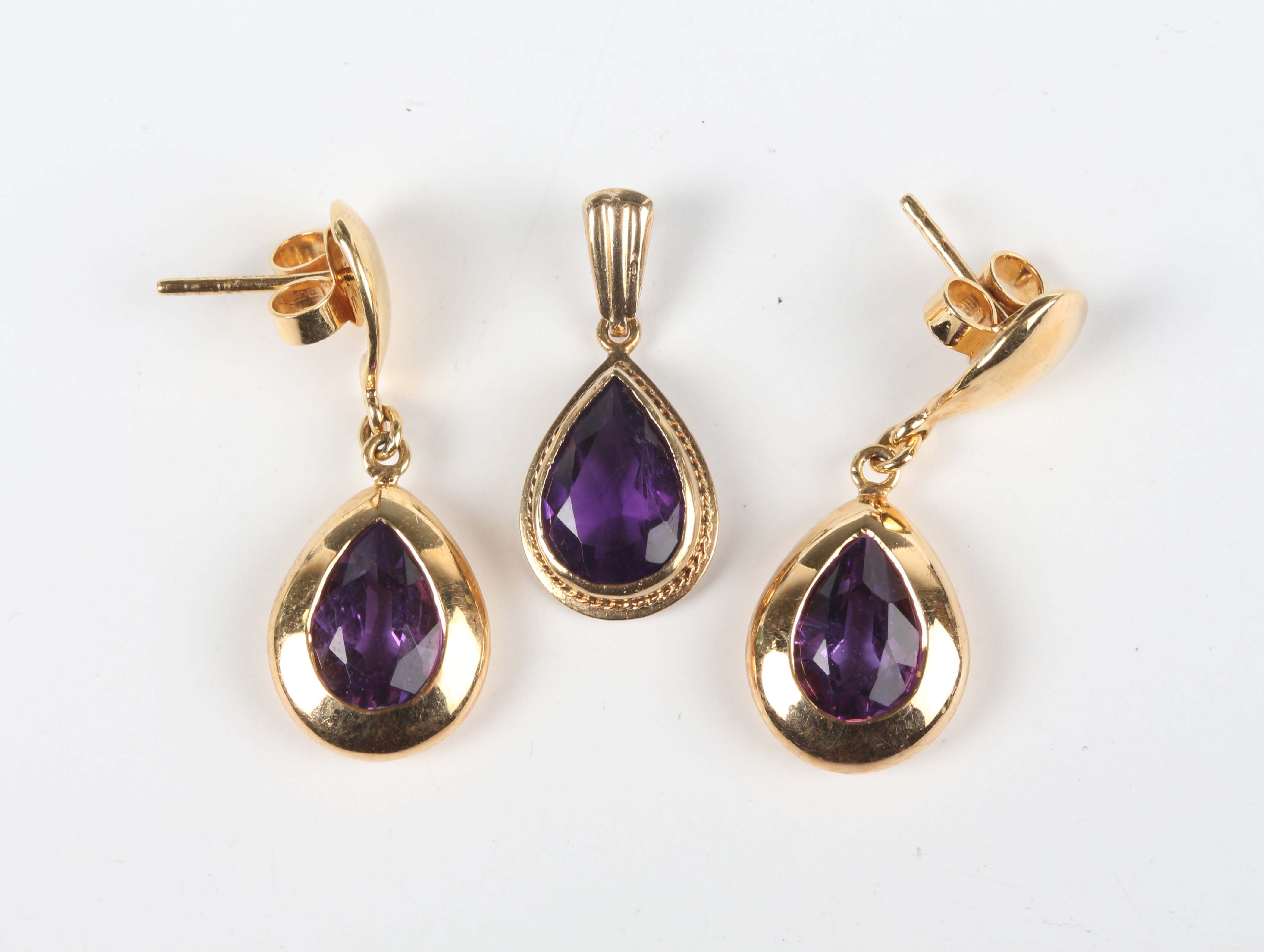 A gold and amethyst single stone pendant, mounted with a pear shaped amethyst, unmarked, weight 0.9g, length 1.9cm, and a pair of 9ct gold and amethyst pendant earrings, each mounted with a pear shaped amethyst, with post and butterfly fittings, weight 4g, length 2.8cm.