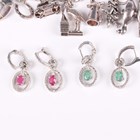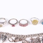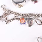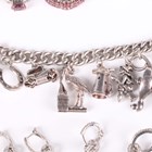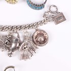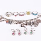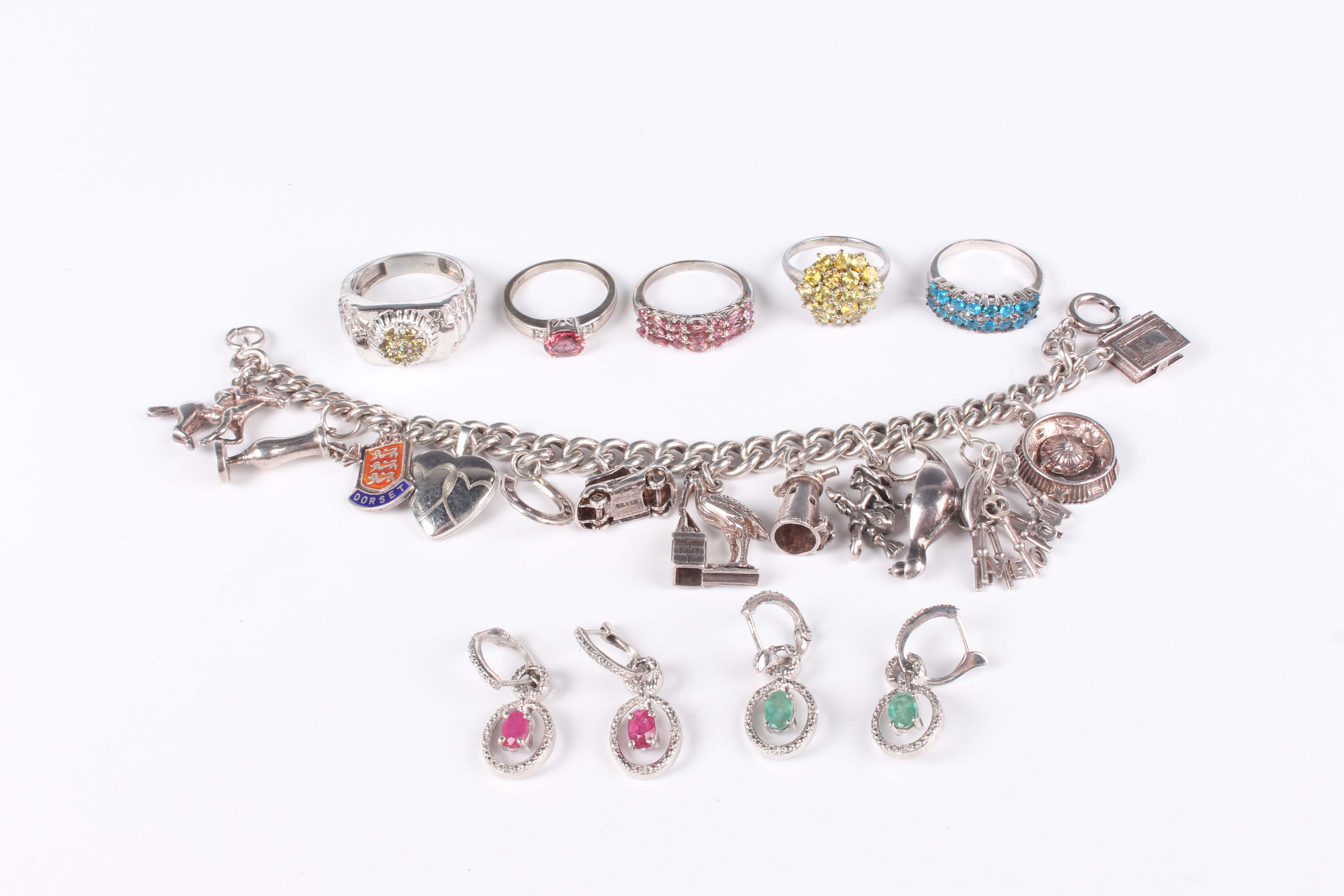 A silver curblink charm bracelet, fitted with a variety of mostly silver charms, including a racehorse and jockey and an oil lamp, total weight 52g, five silver and gem set rings, each detailed ‘925’, and two pairs of silver and gem set earrings, both detailed ‘925’.