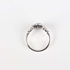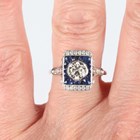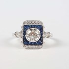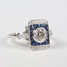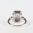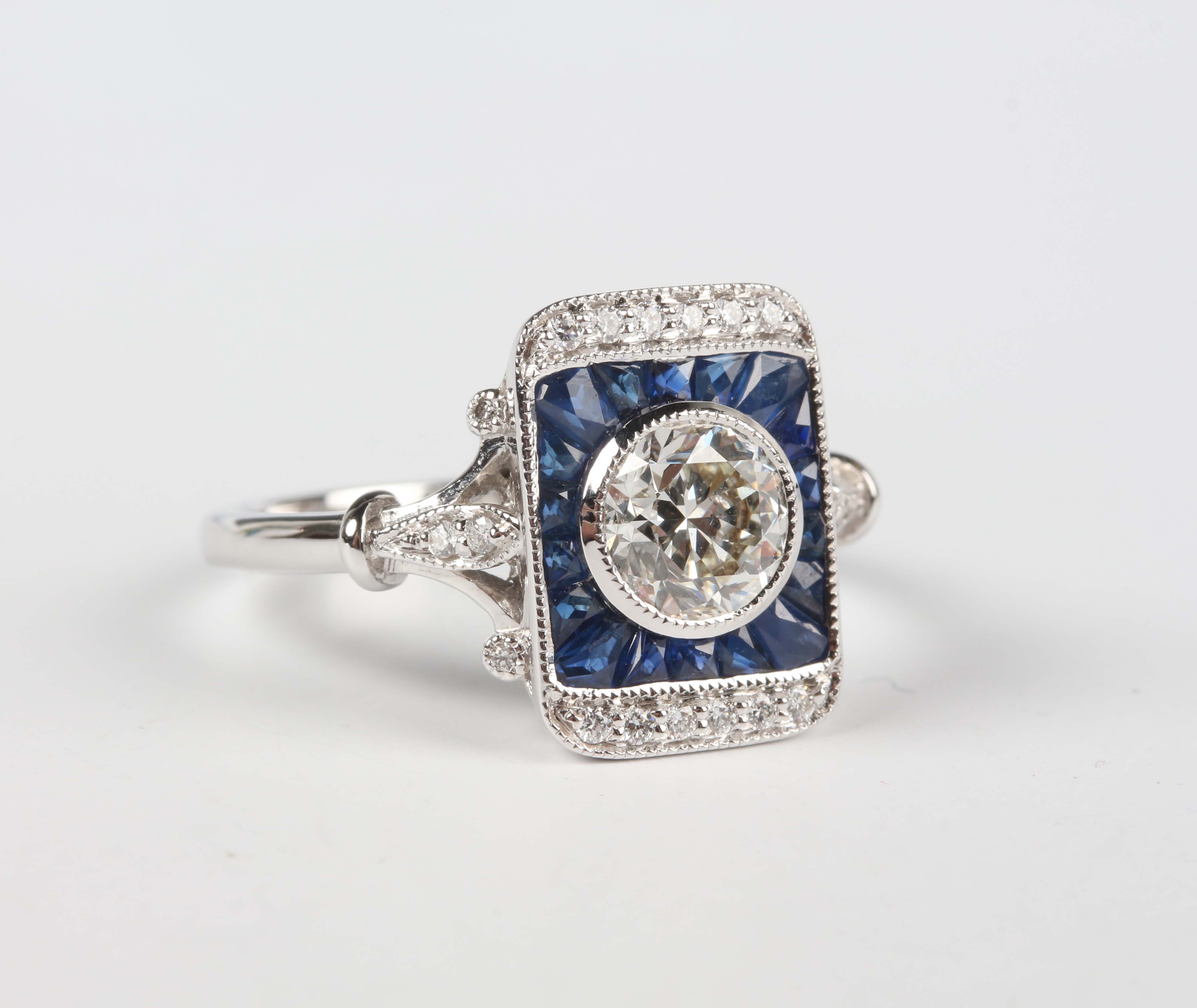 A white gold, sapphire and diamond panel ring, collet set with the principal circular cut diamond within a surround of calibre cut sapphires, otherwise mounted with circular cut diamonds between foliate diamond set shoulders, detailed ‘18K’, weight 3.9g, principal diamond weight approx 1.01ct, ring size approx M1/2.