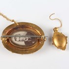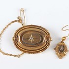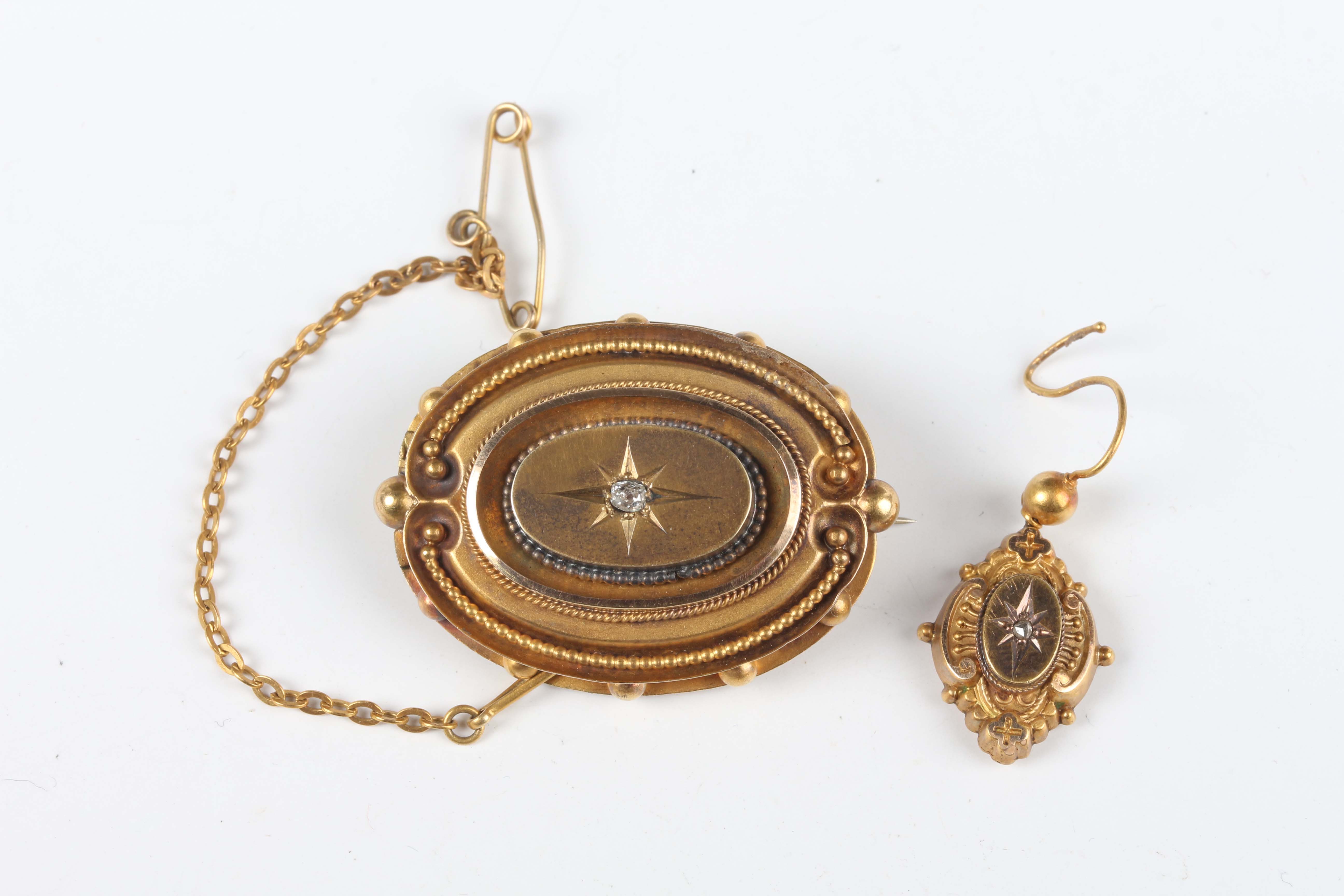 A Victorian gold and diamond oval brooch, star gypsy set with a cushion shaped diamond within a bead and wirework surround, unmarked, weight 6.6g, width 3.3cm, and a single gold and diamond pendant earring, unmarked, weight 0.9g, length 2.7cm.