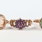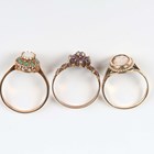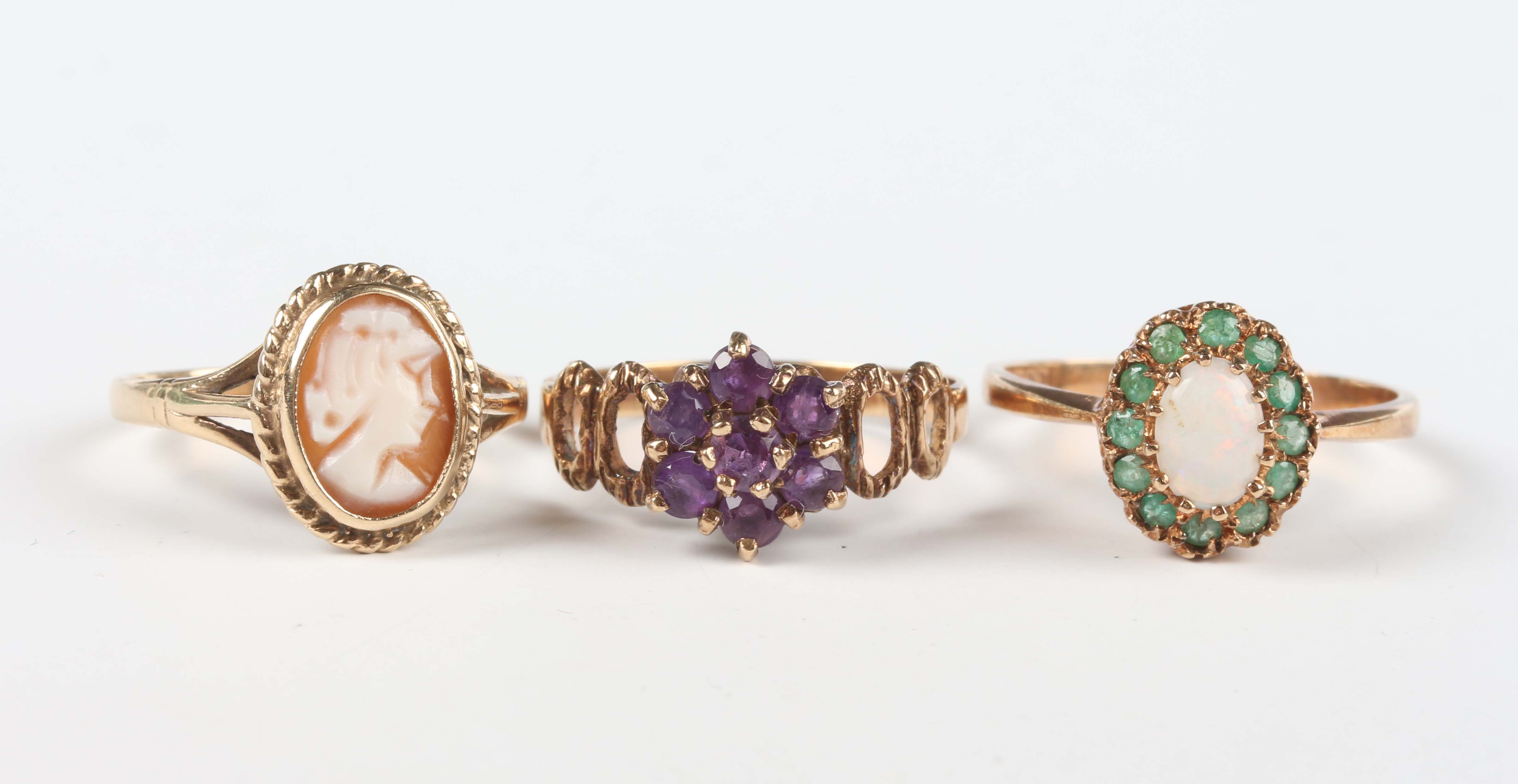 A 9ct gold, opal and emerald oval cluster ring, Birmingham 1977, ring size approx R1/2, a 9ct gold and amethyst seven stone cluster ring, ring size approx Q, and a 9ct gold and oval shell cameo ring, carved as a portrait of a lady, total weight 6.4g.