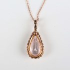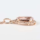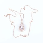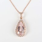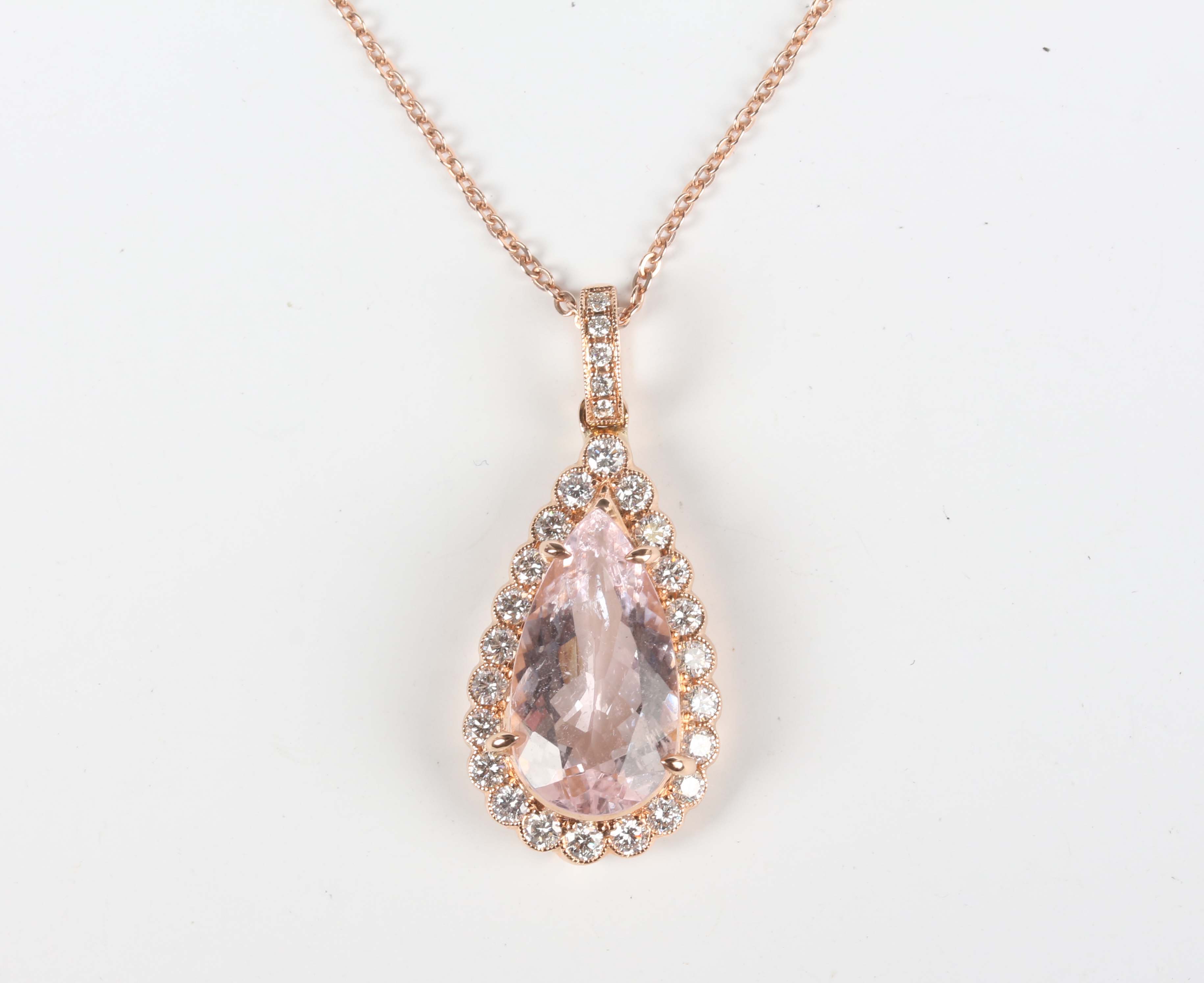 A rose gold, morganite and diamond pear shaped pendant, claw set with the pear shaped morganite within a surround of circular cut diamonds, detailed ‘750’, weight 3.4g, morganite weight approx 3.88ct, length 3cm, with a silver gilt neckchain, detailed ‘925 Italy’, weight 1.2g, length 45cm, with a case.