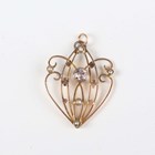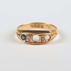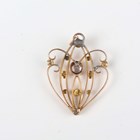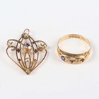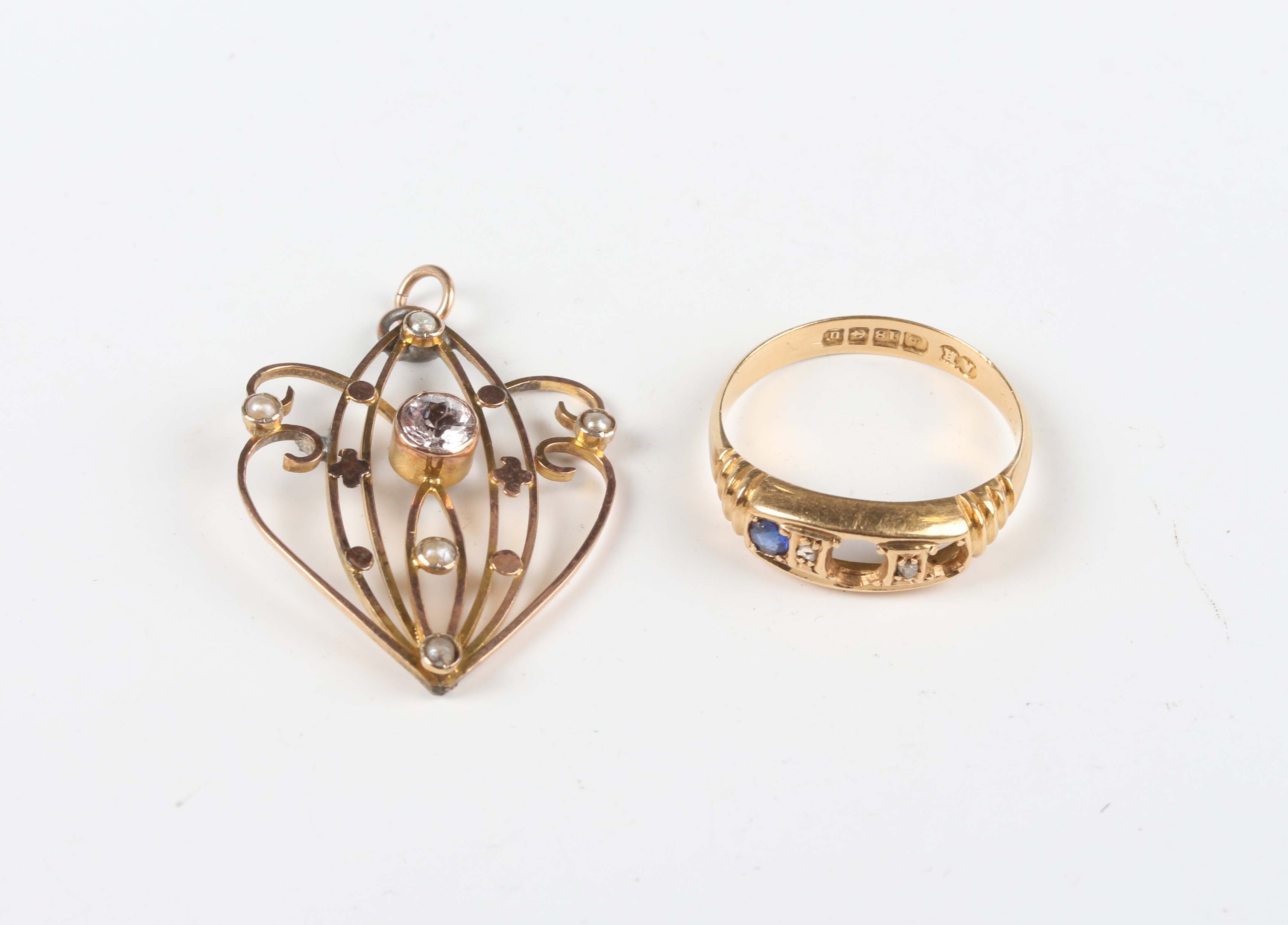 An 18ct gold ring, mounted with a sapphire and two diamonds, Birmingham 1919, weight 2.9g, ring size approx O1/2 (two gems lacking), and a gold, seed pearl and pale pink gem set pendant, indistinct mark, weight 2.1g, length 3.2cm.