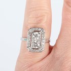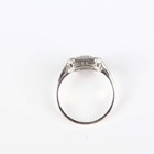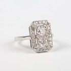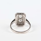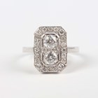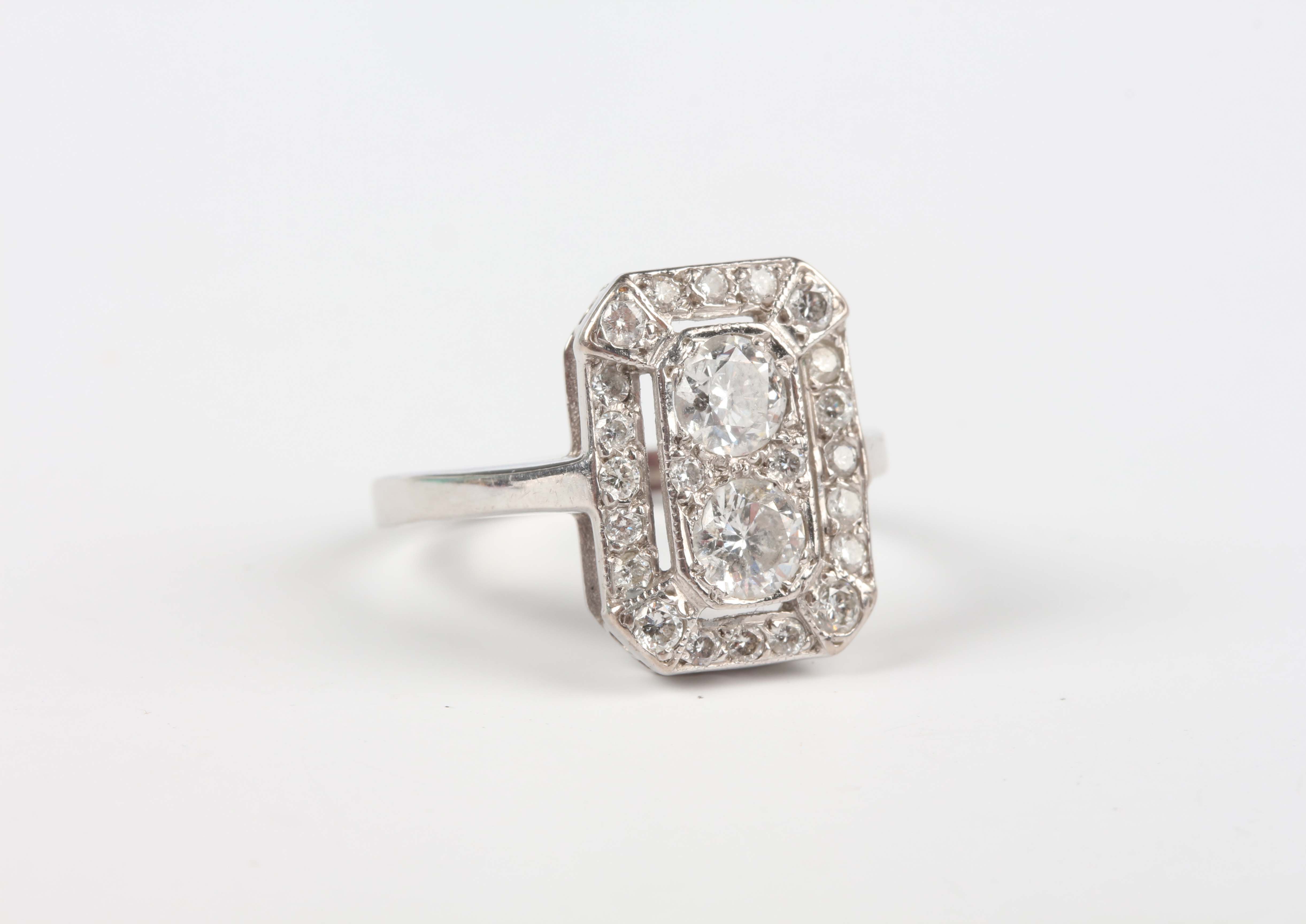A white gold and diamond panel ring of cut cornered rectangular form, mounted with the two principal circular cut diamonds at the centre, unmarked, weight 3.3g, total diamond weight approx 0.70-0.80ct, ring size approx K.