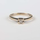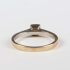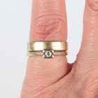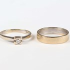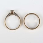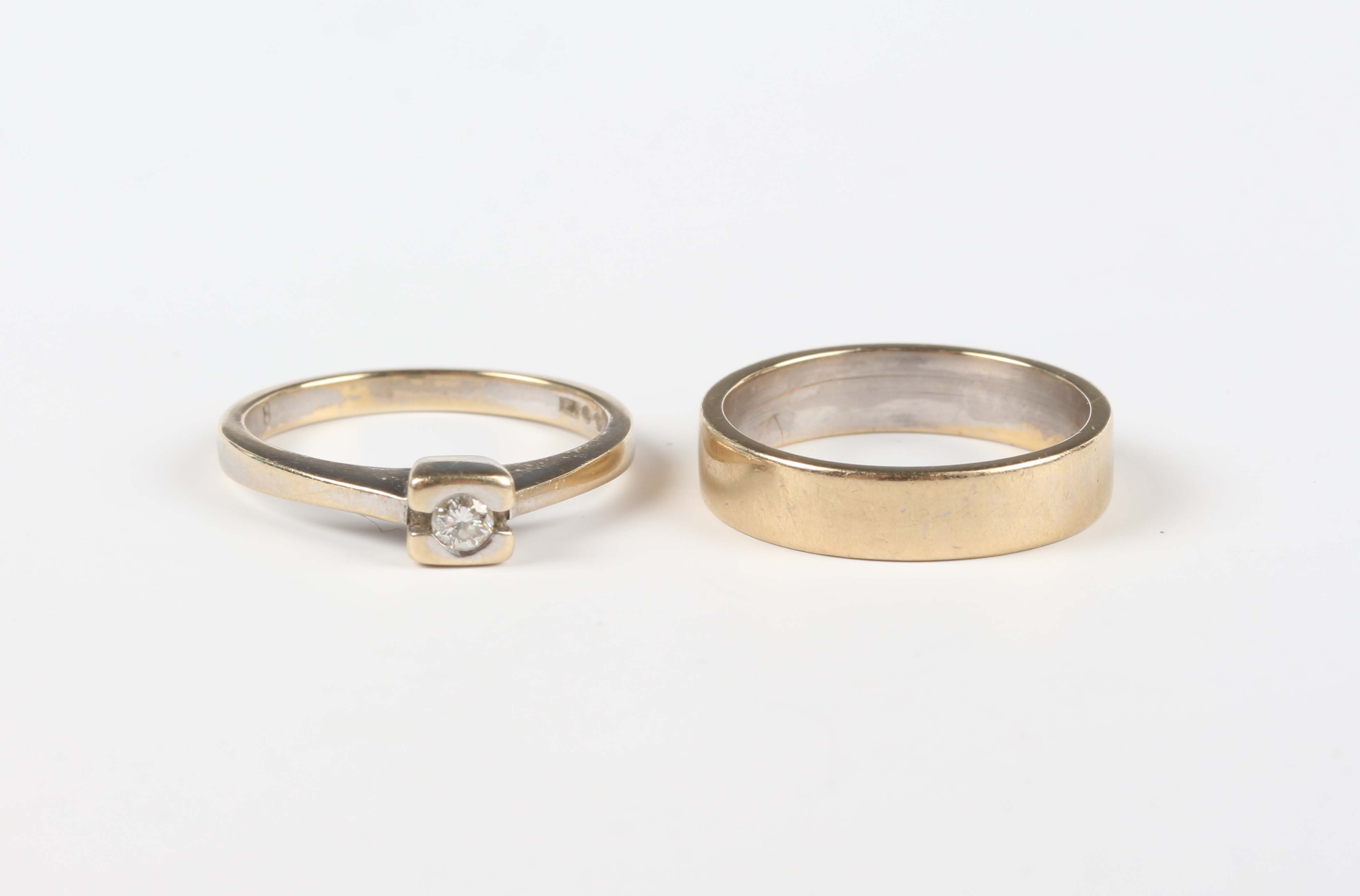 A gold wedding ring, detailed ‘750’, ring size approx J1/2, and a gold and diamond single stone ring, detailed ‘750’, ring size approx J, total weight 6.7g.