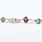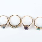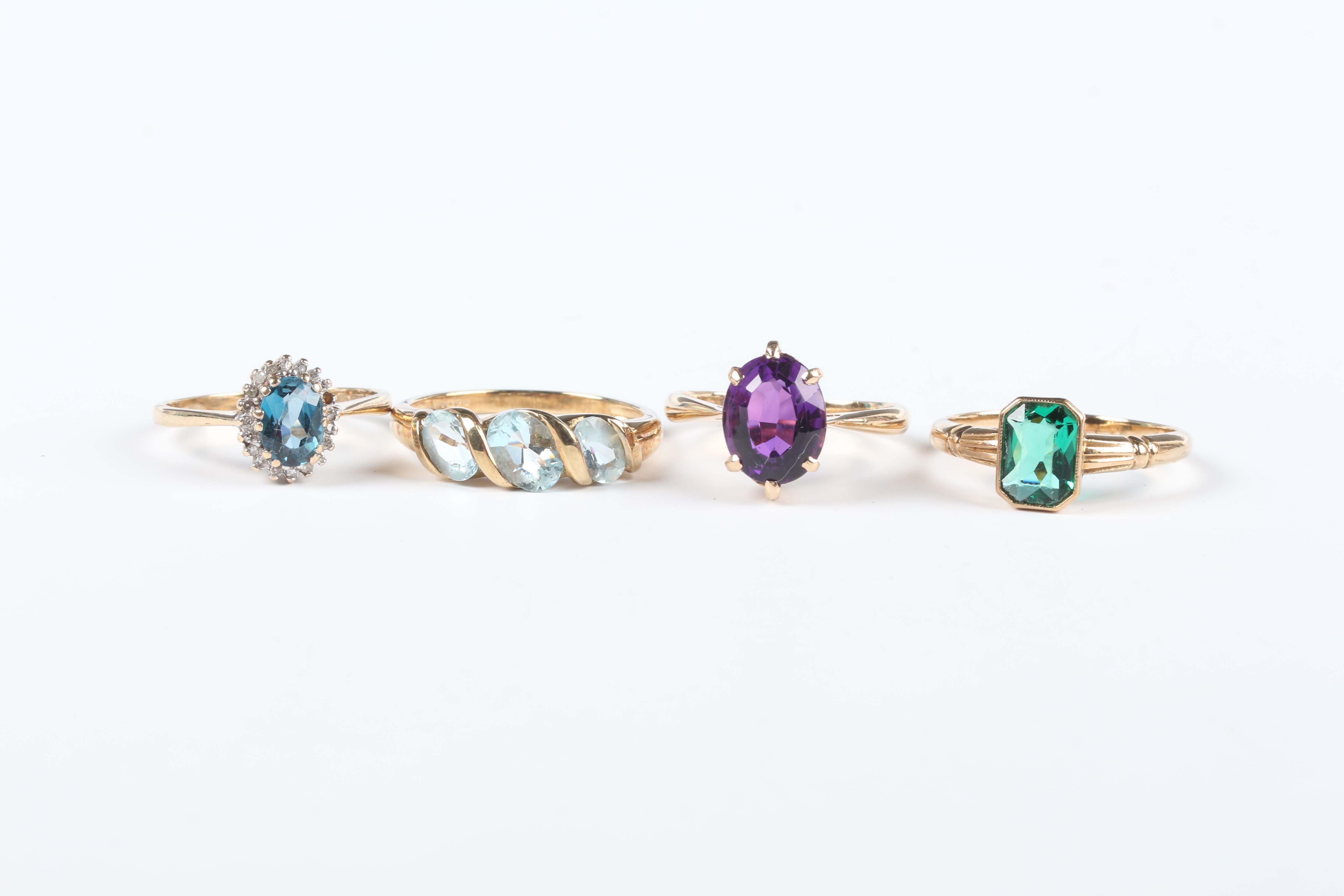 A 9ct gold ring, claw set with an oval cut amethyst, London 1965, ring size approx O1/2, a 9ct gold, blue topaz and diamond oval cluster ring (one small diamond lacking), a 9ct gold and aquamarine three stone ring and a 9ct gold and green paste set ring, Chester 1930, total weight 10.1g.