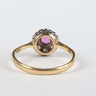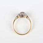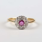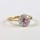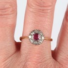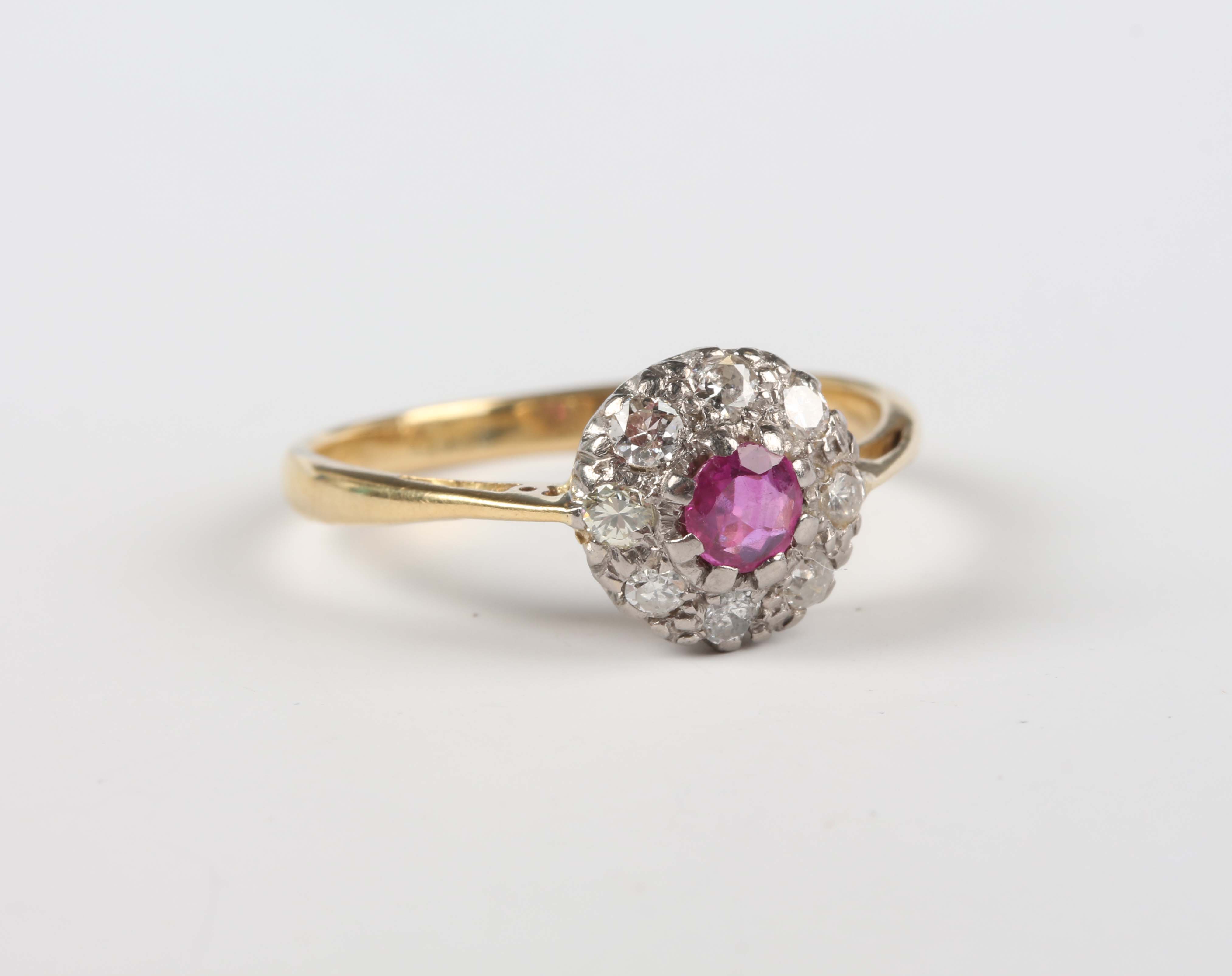 A gold, ruby and diamond cluster ring, claw set with the cushion shaped ruby within a surround of eight variously cut diamonds, detailed ‘18ct’, weight 3.1g, ring size approx R1/2.