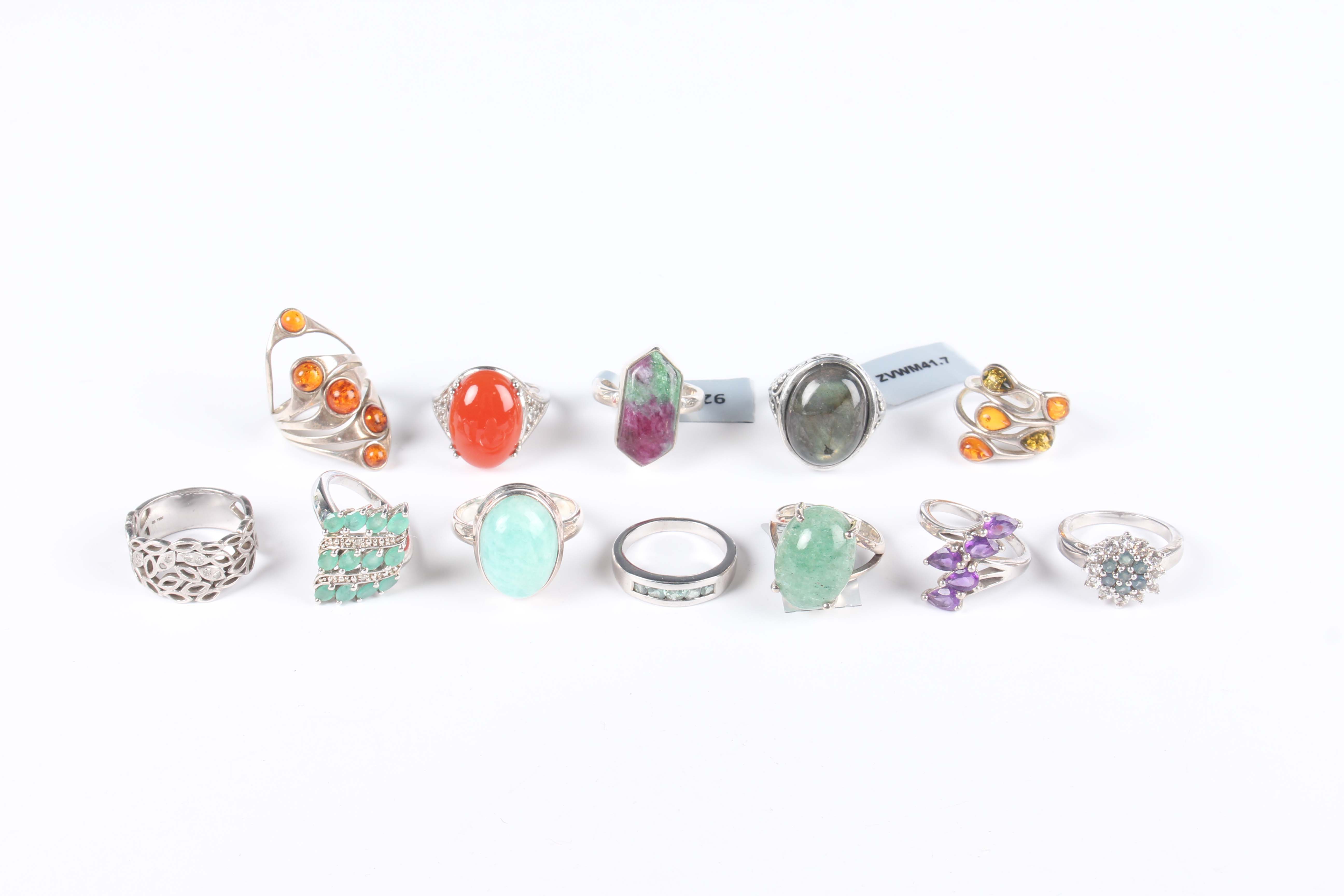 Twelve silver and gem set rings, including an emerald and diamond lozenge shaped ring, ring size approx L, an alexandrite and white topaz cluster ring, ring size approx N, a labradorite oval ring and a foliate band ring, mounted with eight circular cut diamonds, total weight 71.3g, with twelve Gemporia Authenticity certificates.