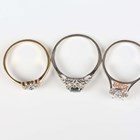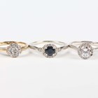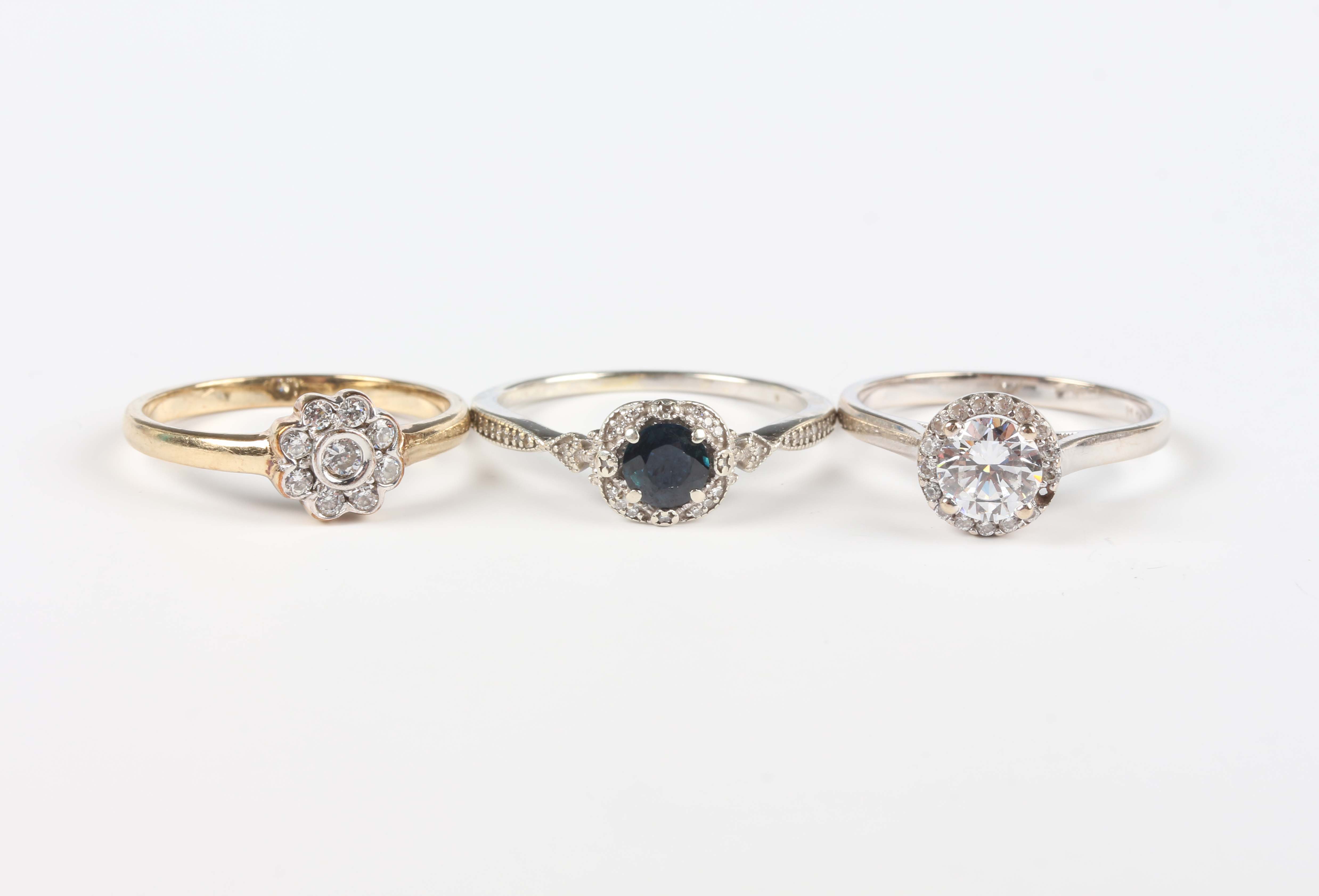 A 9ct white gold, sapphire and diamond cluster ring, ring size approx Q, a 9ct gold and colourless gem set nine stone cluster ring, total weight 4.1g, and a white gold and colourless gem set cluster ring, detailed ‘585’, weight 2.5g.