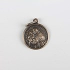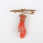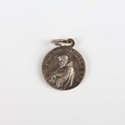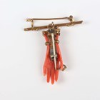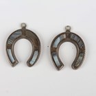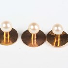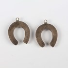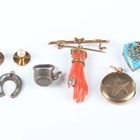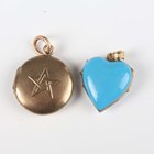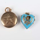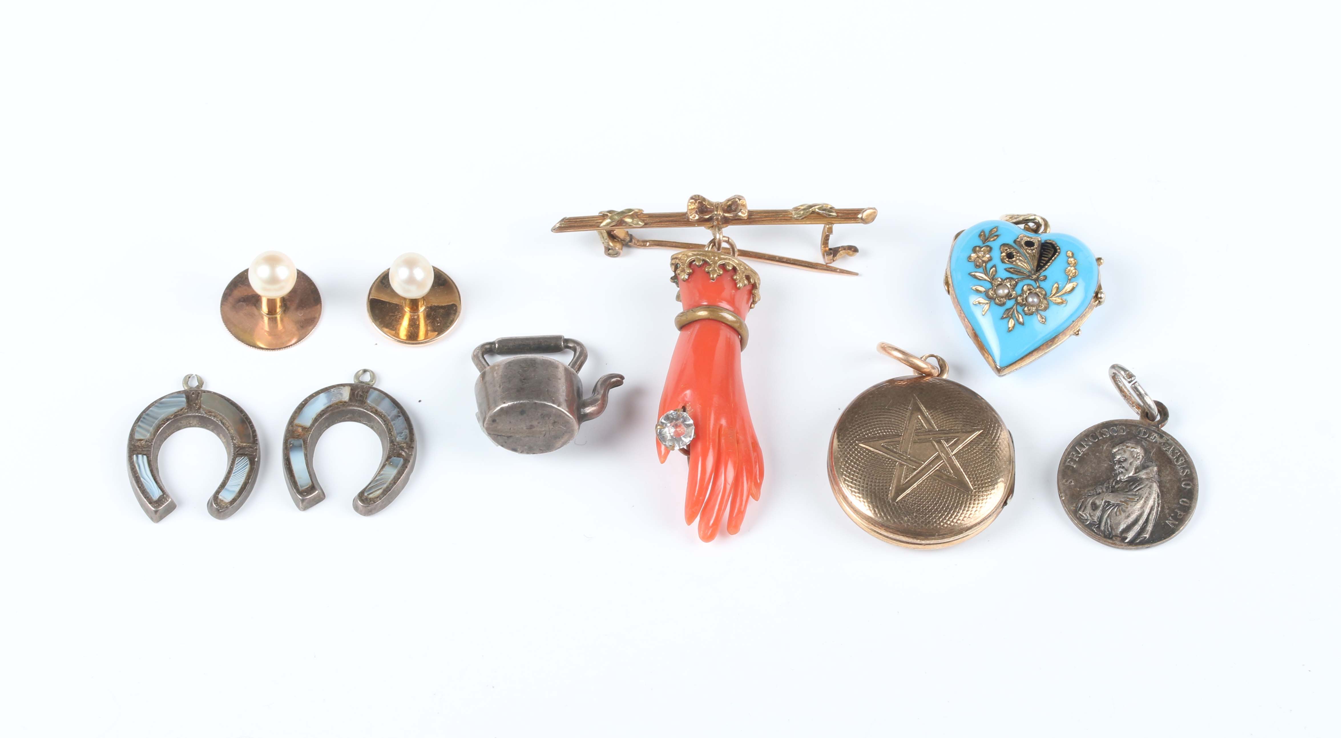 A gilt metal, pale blue enamelled and seed pearl heart shaped pendant locket, the front with a butterfly and floral spray motif, length 2.8cm, a Victorian kettle charm, two horseshoe charms, a circular pendant locket, a pair of gold and cultured pearl dress studs, detailed ‘9ct’, weight 1.8g, another cultured pearl dress stud, unmarked, a devotional pendant and a bar brooch suspending an imitation coral and colourless paste pendant.