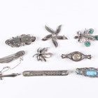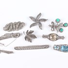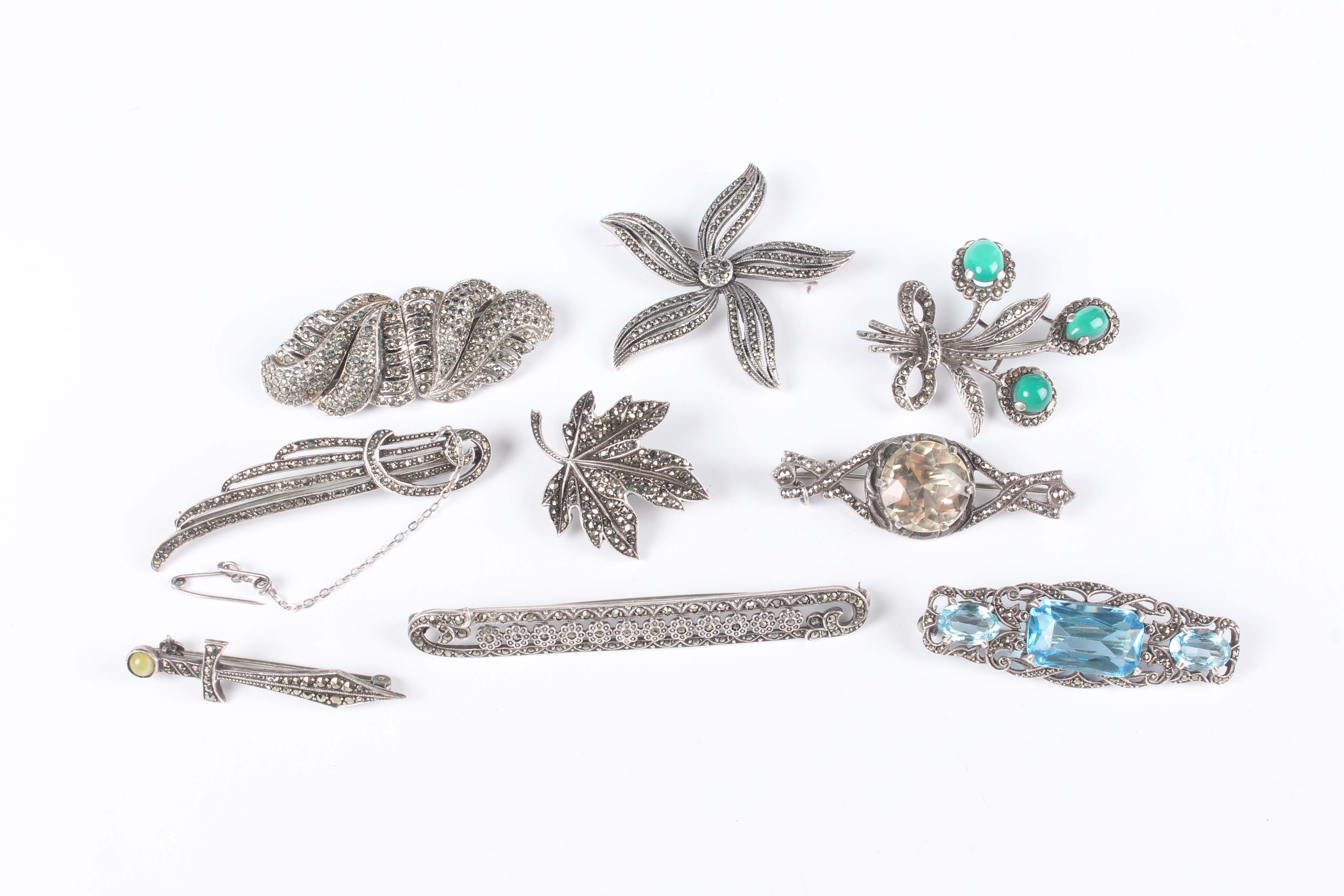 Two .935 silver and marcasite brooches, total weight 13.8g, four further silver and gem set brooches, total weight 33.5g, and three marcasite and gem set brooches, each unmarked.