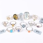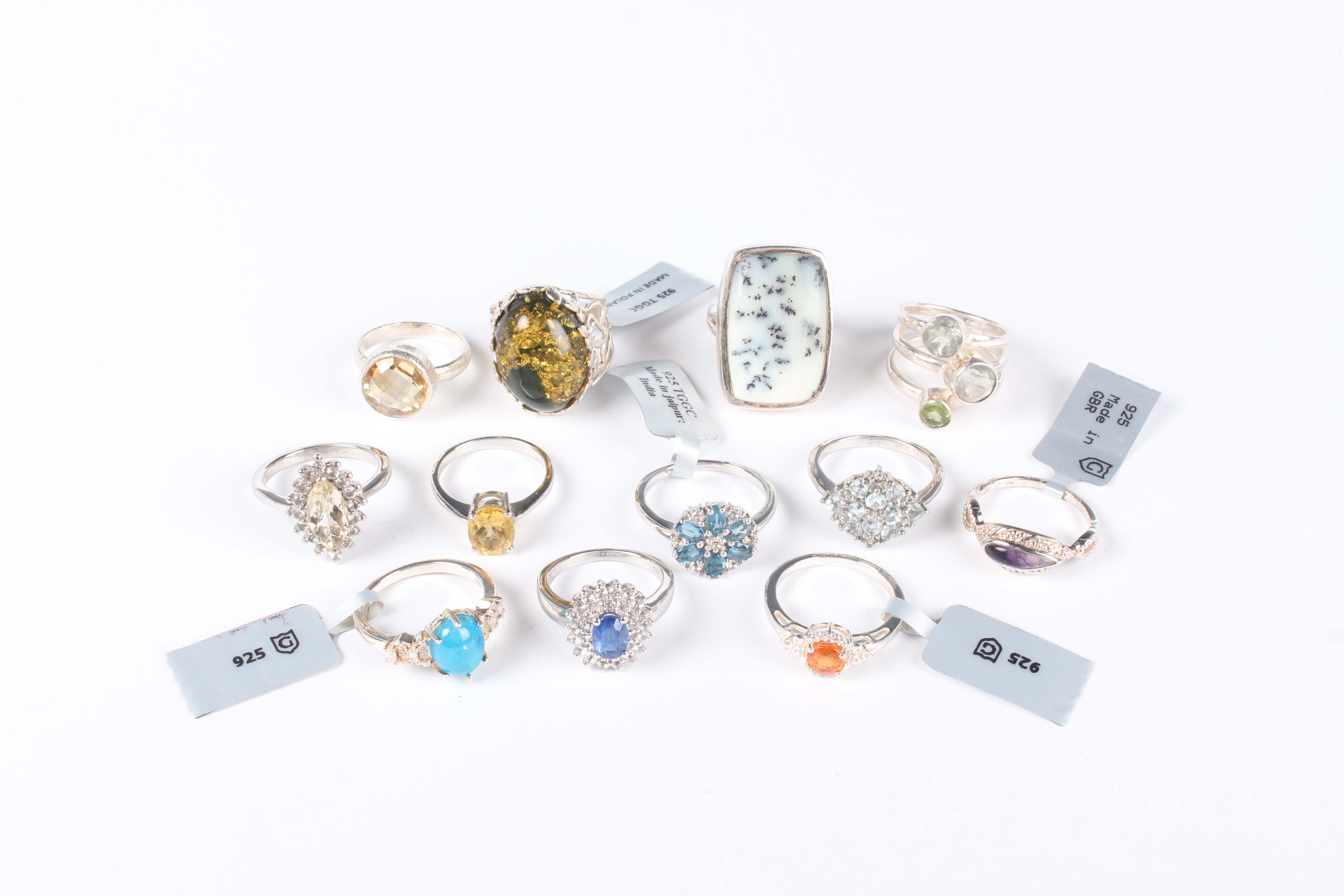 Twelve silver and gem set rings, including a mandarin garnet and white zircon cluster ring, ring size approx N, a kyanite and white topaz cluster ring, ring size approx L, a golden beryl single stone ring and an apatite and white zircon ring, total weight 51.8g, with twelve Gemporia Authenticity certificates.