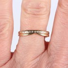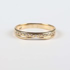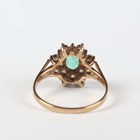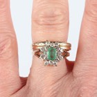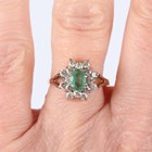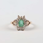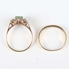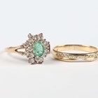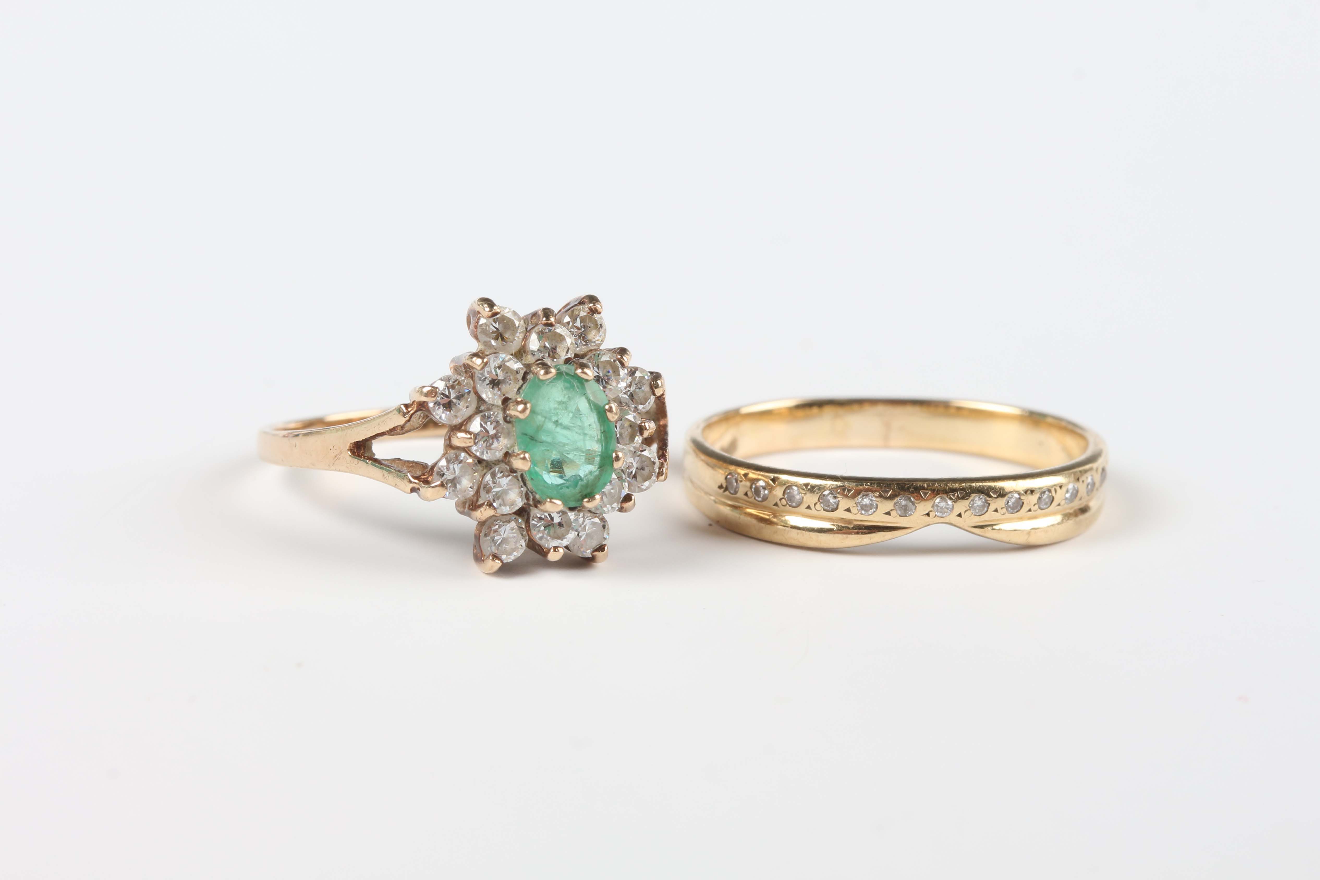A 9ct gold, emerald and colourless gem set cluster ring, claw set with the oval cut emerald at the centre, London 1982, weight 2.2g, ring size approx N1/2, and a gold and diamond ring in a twist design, mounted with a row of small circular cut diamonds, unmarked, weight 1.7g, ring size approx L1/12.