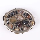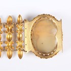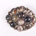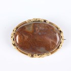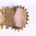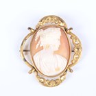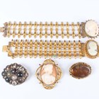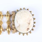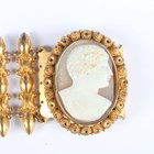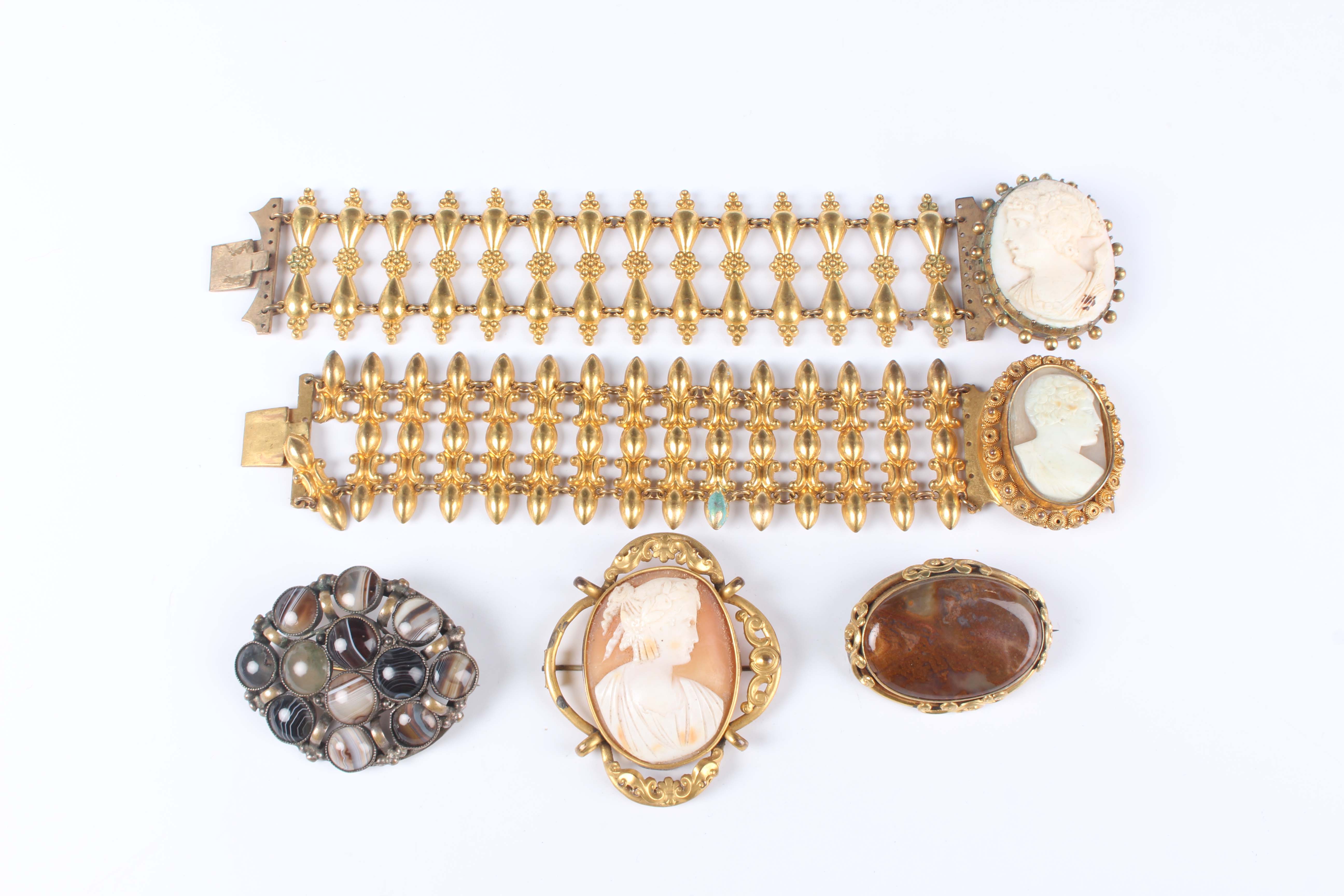 A group of mostly Victorian jewellery, comprising two similar gilt metal and shell cameo bracelets, lengths 18.5cm and 20.5cm, a gilt metal mounted oval shell cameo brooch, a gilt metal mounted oval agate brooch and a varicoloured agate brooch.
