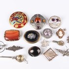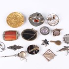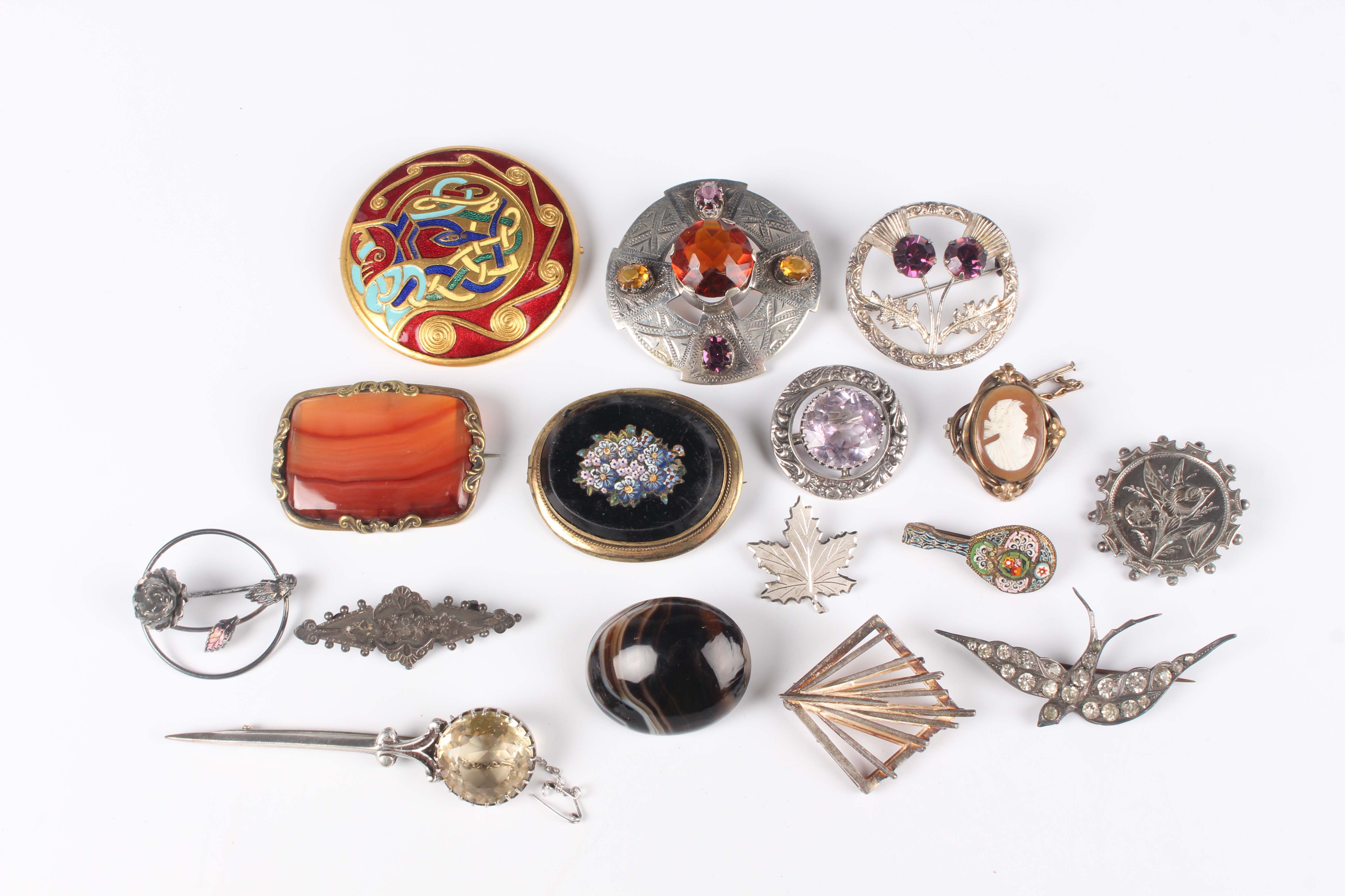 Sixteen brooches, including a pale amethyst single stone circular brooch, width 3cm, a mauve paste brooch, designed as a thistle spray, and a colourless paste set swallow brooch.