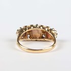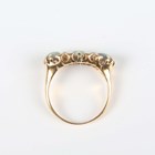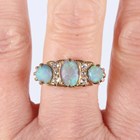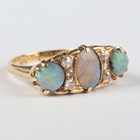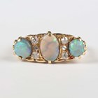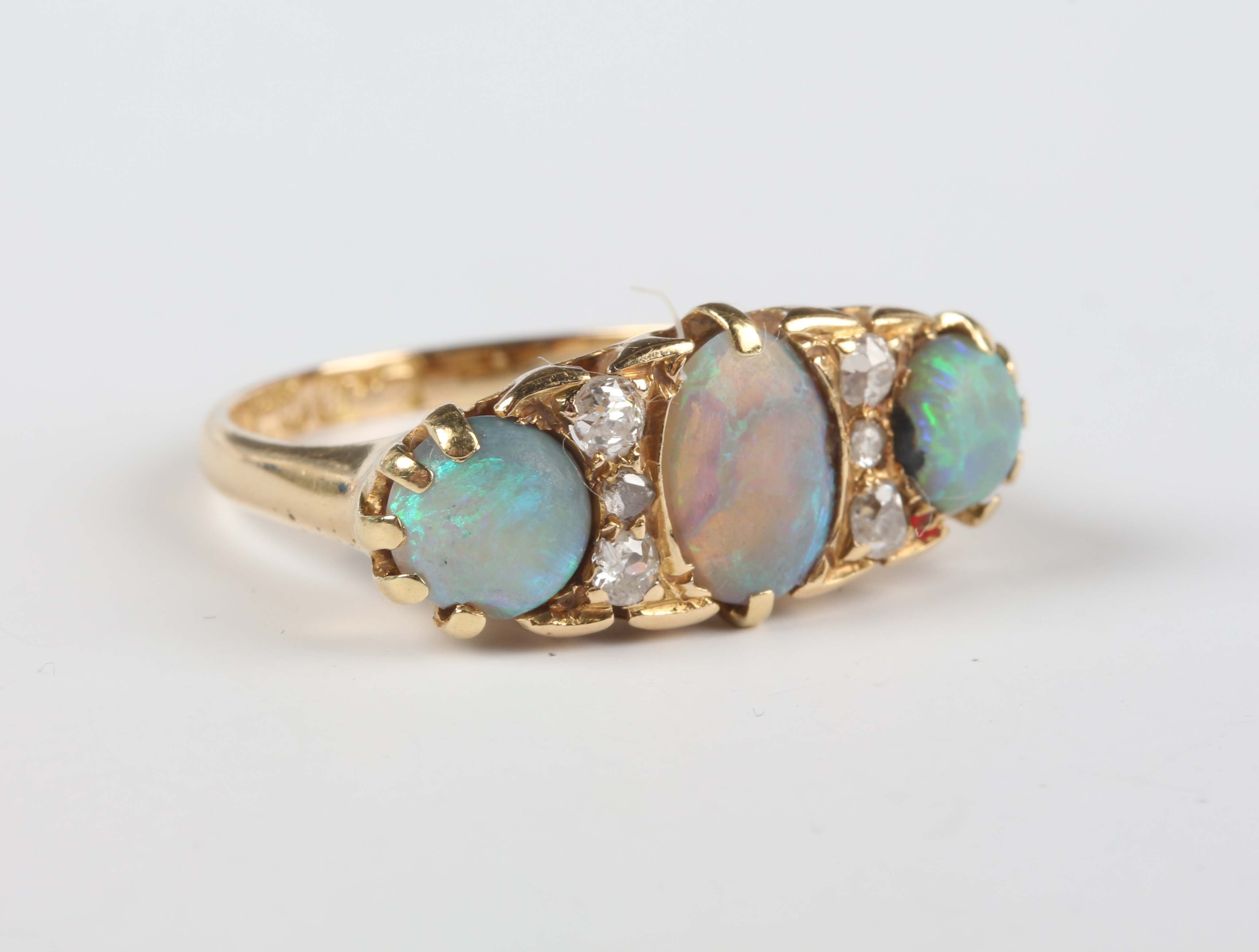 An Edwardian 18ct gold, opal and diamond ring, mounted with three opals alternating with two diamond three stone divisions, Birmingham 1909, weight 5.2g, ring size approx Q1/2.