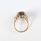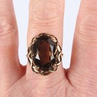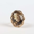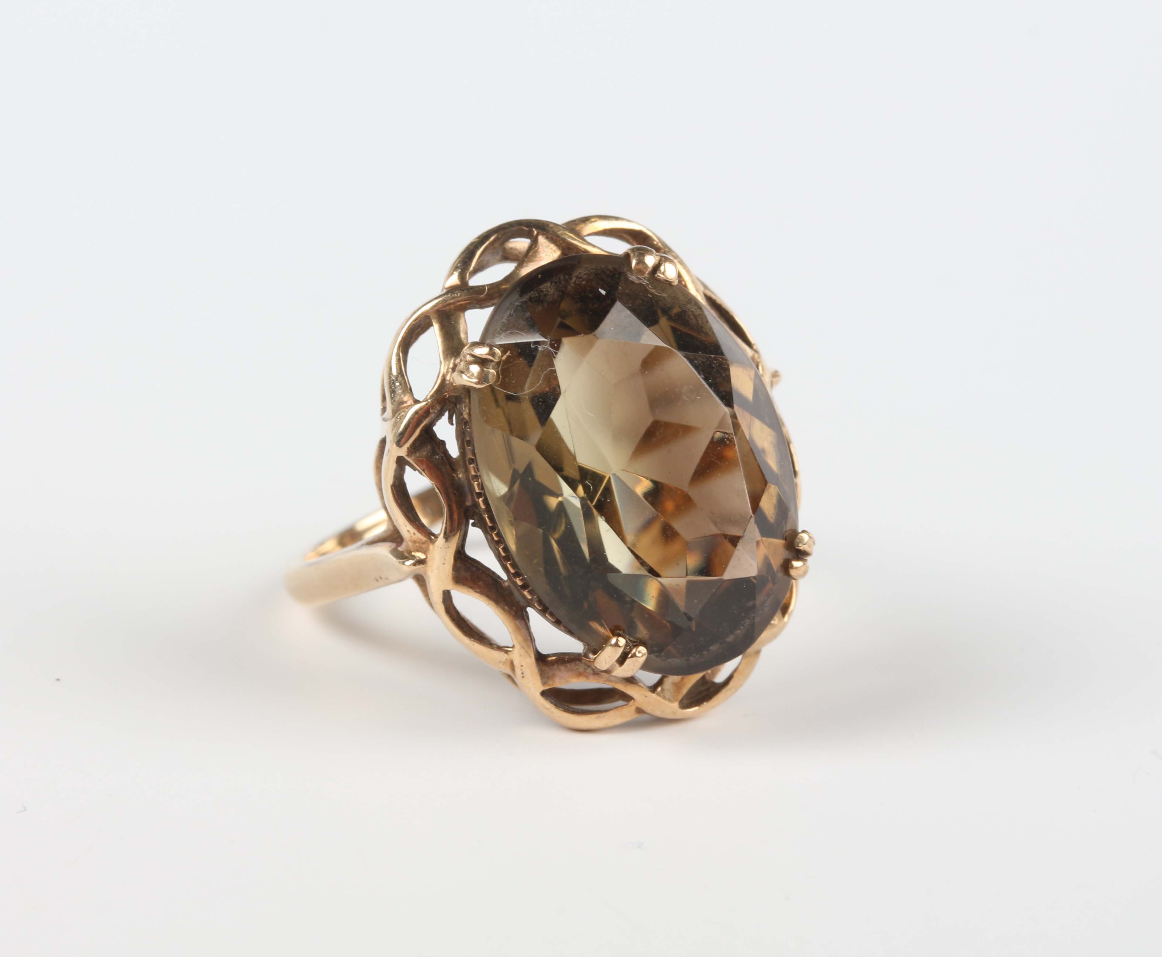 A 9ct gold ring, claw set with an oval cut smoky quartz within a pierced loop surround, London 1969, weight 5.6g, ring size approx P.