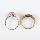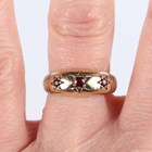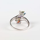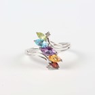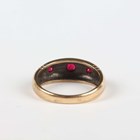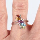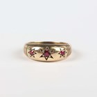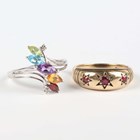 A 9ct white gold and varicoloured gemstone set ring in a twistover design, Birmingham 2004, ring size approx P, and a 9ct gold and treated ruby three stone ring, ring size approx N, total weight 6.2g.