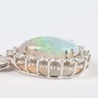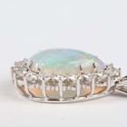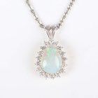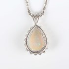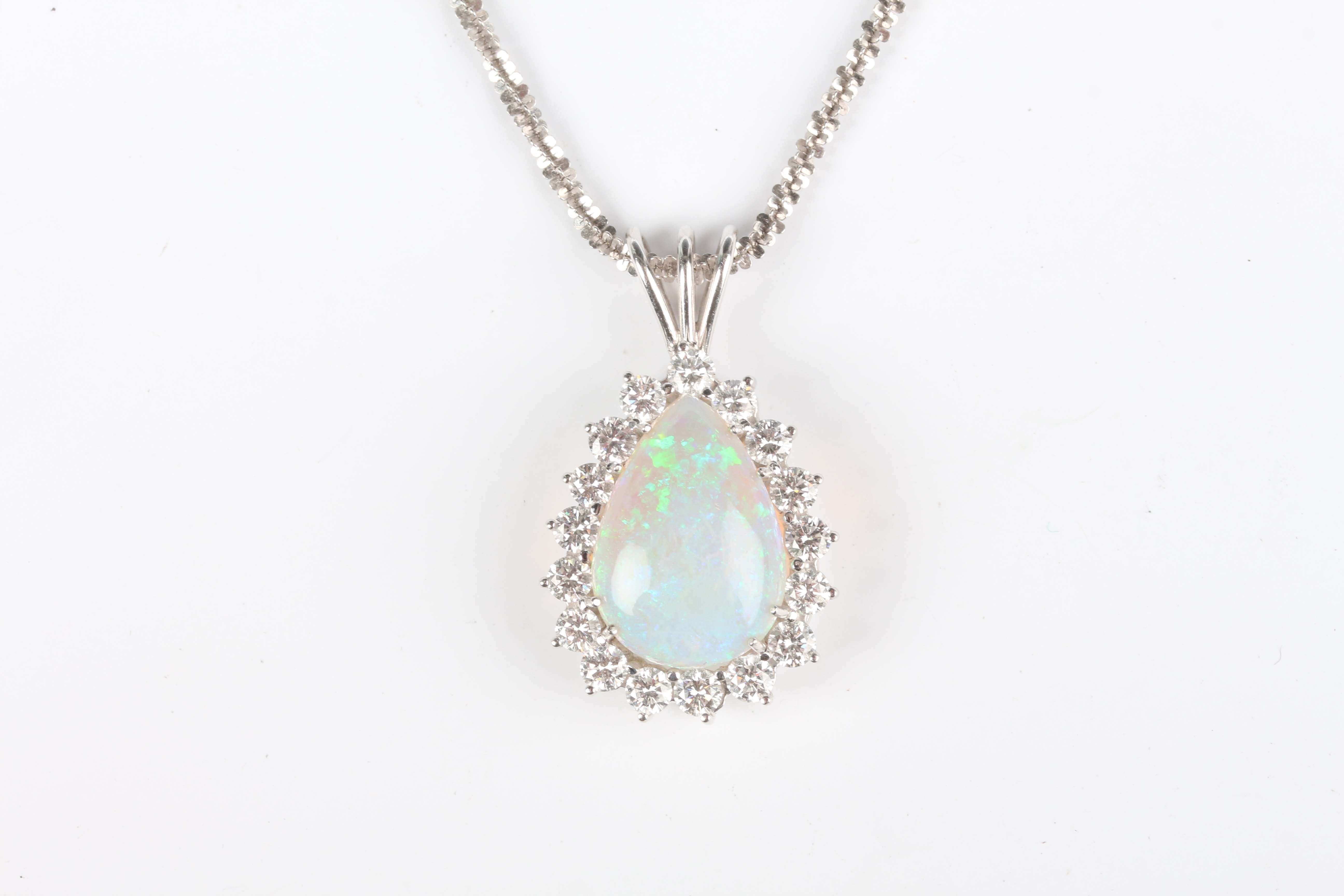 A white gold, opal and diamond pendant, mounted with a pear shaped opal within a surround of circular cut diamonds, length 3.3cm, with a white gold neckchain, detailed ‘750’, on a sprung hook shaped clasp, length 45.5cm, total weight 11.4g.