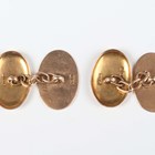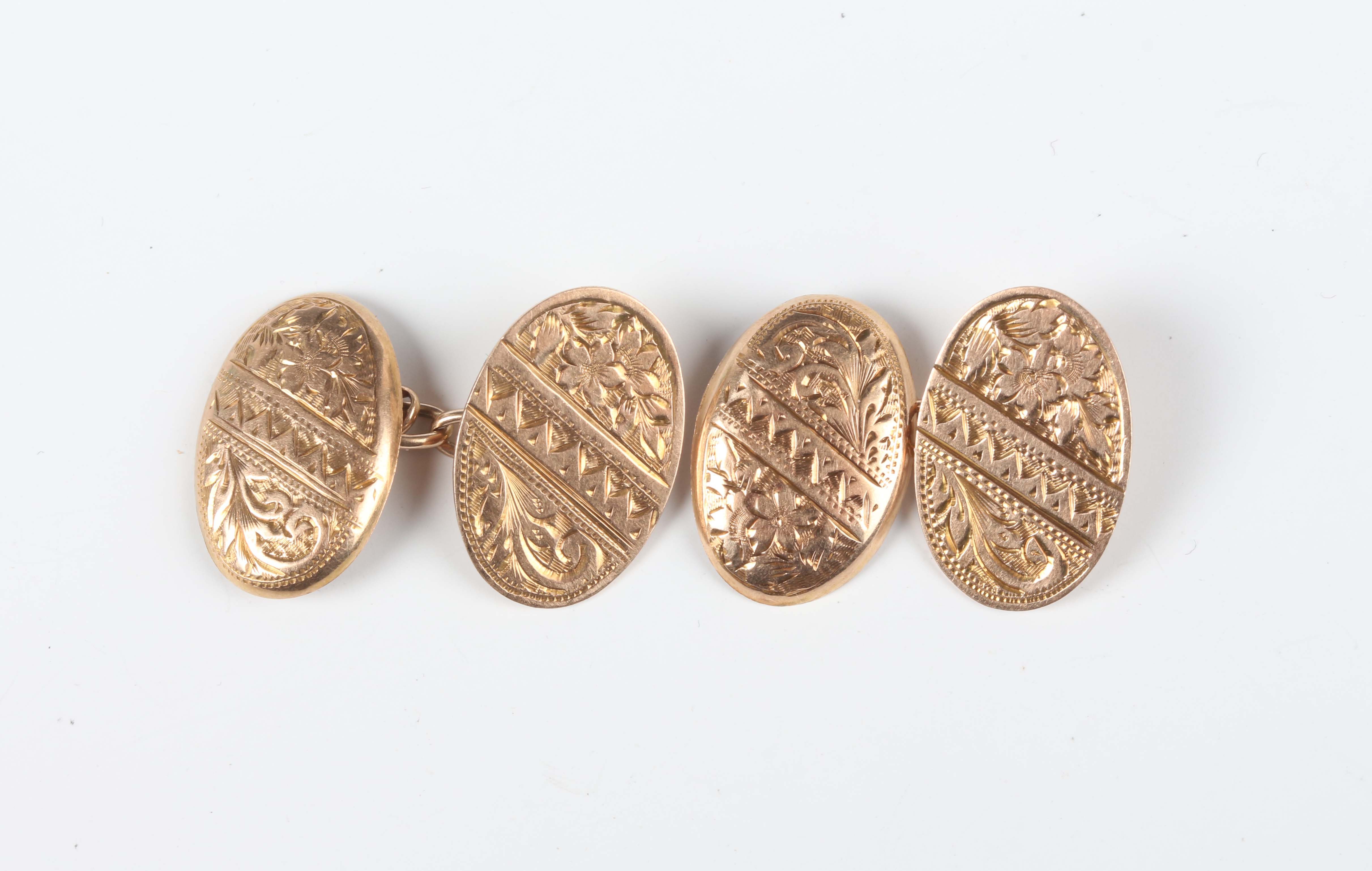 A pair of 9ct gold oval cufflinks with engraved decoration, Chester 1910, weight 3g, dimensions of each front 1.6cm x 1.1cm.
