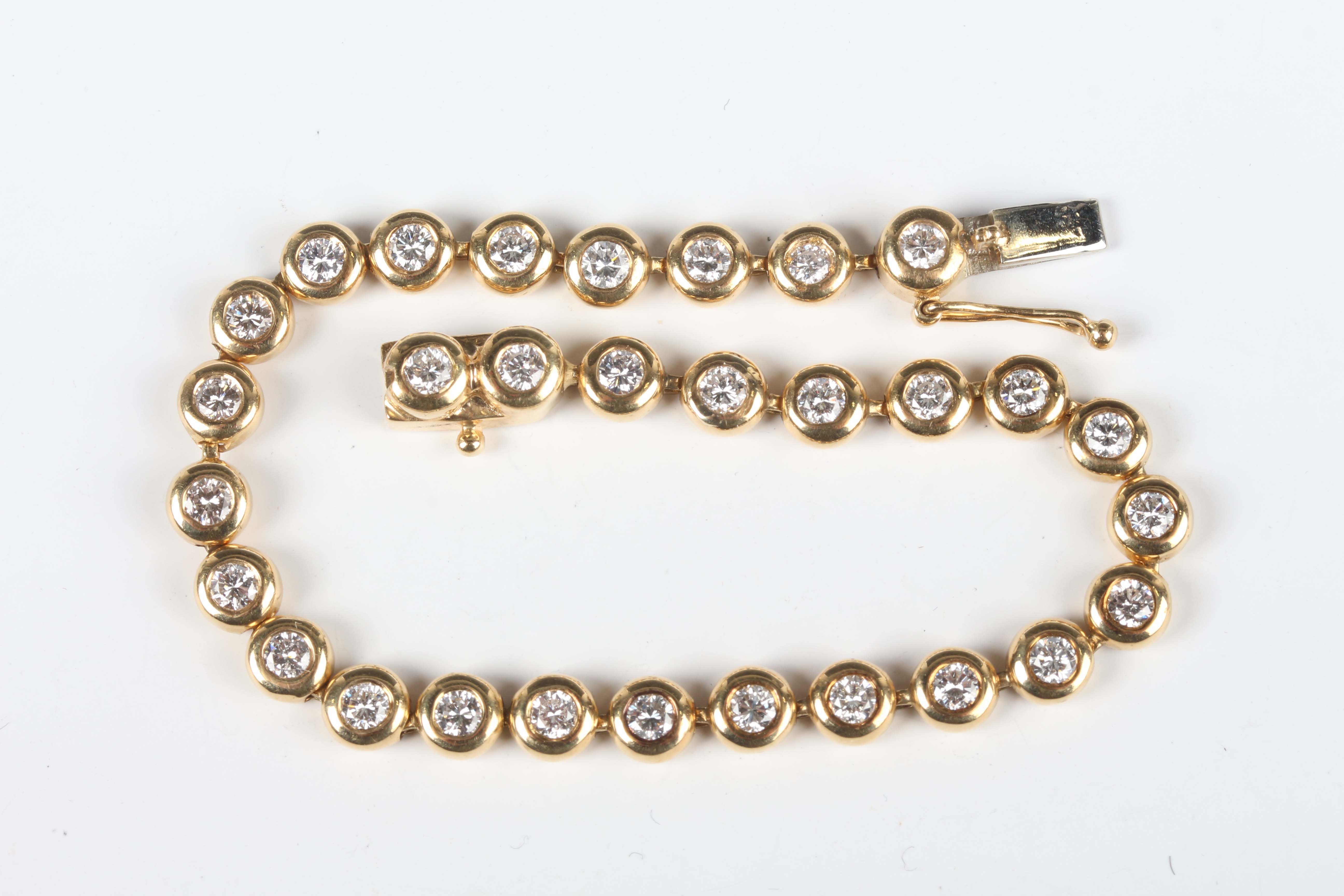 An 18ct gold and diamond line bracelet, collet set with a row of circular cut diamonds, on a snap clasp, weight 15.8g, length 17.5cm, total diamond weight approx 2.70-3.00ct.