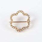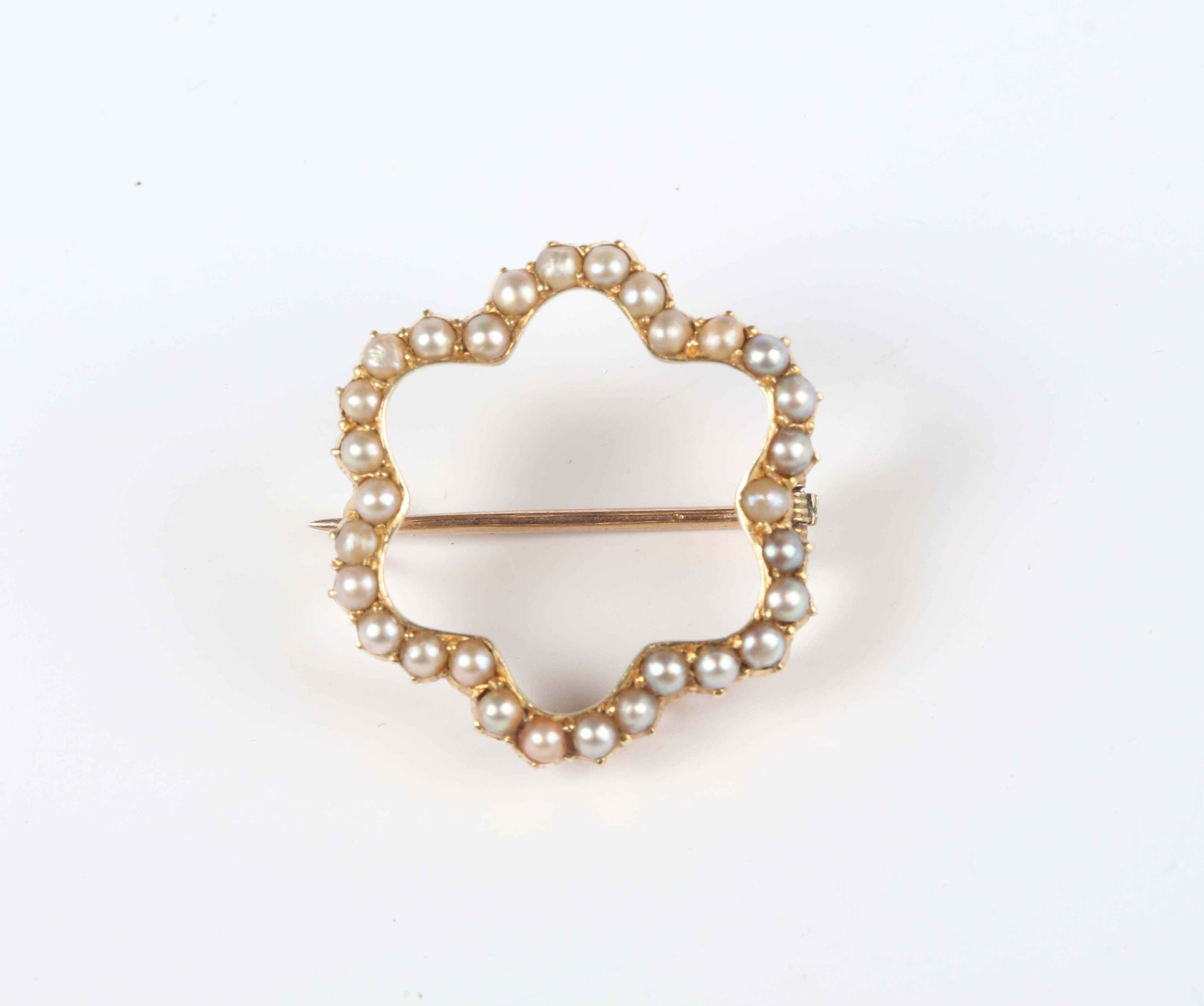 An Edwardian gold and seed pearl brooch in a curved openwork design, unmarked, weight 3.2g, width 2.3cm.