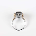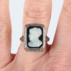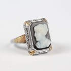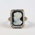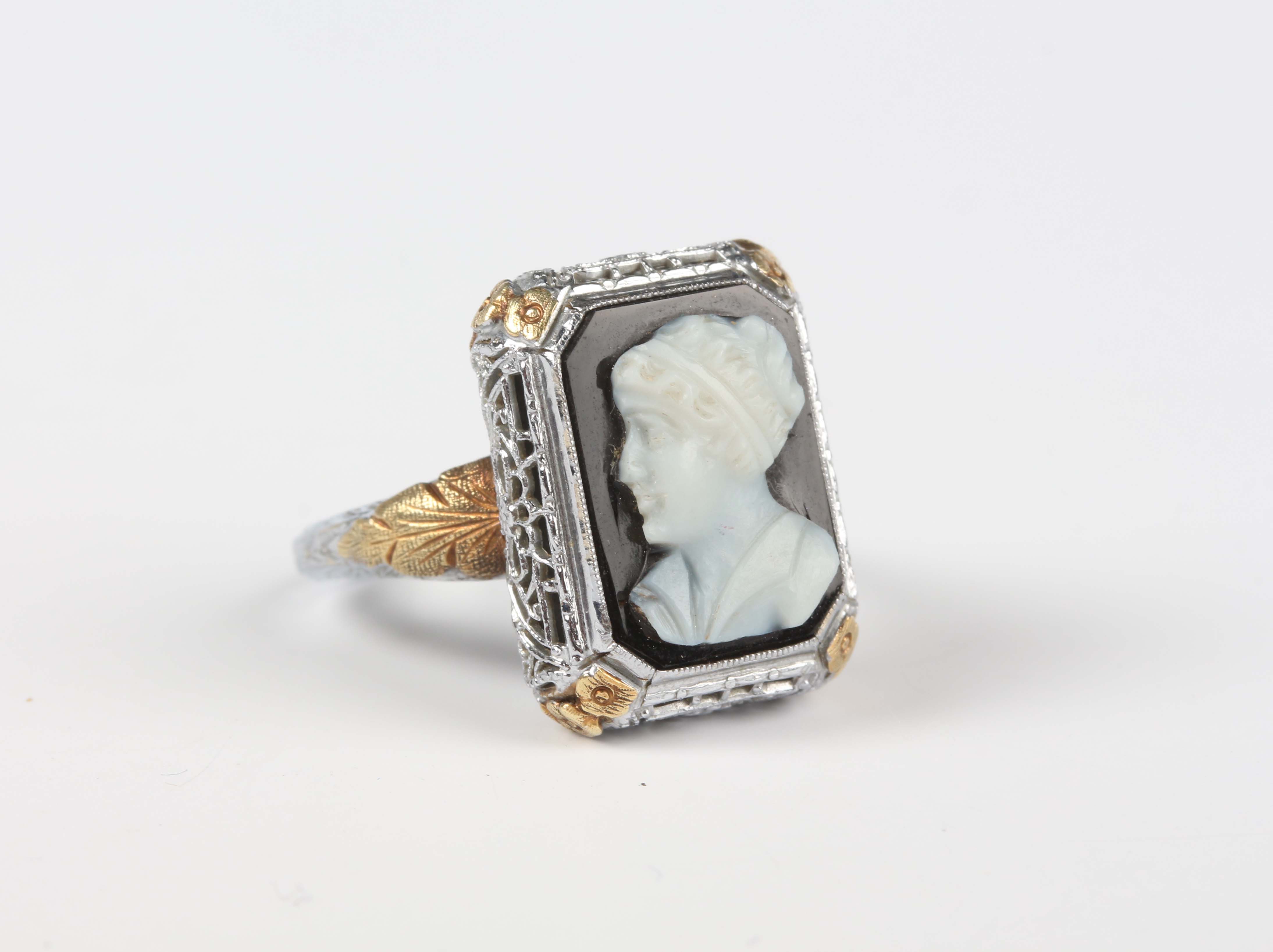 A two colour gold and banded agate cameo ring, carved as a portrait of a lady between foliate shoulders, detailed ’14K’, weight 5.2g, ring size approx L.