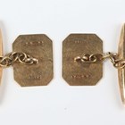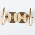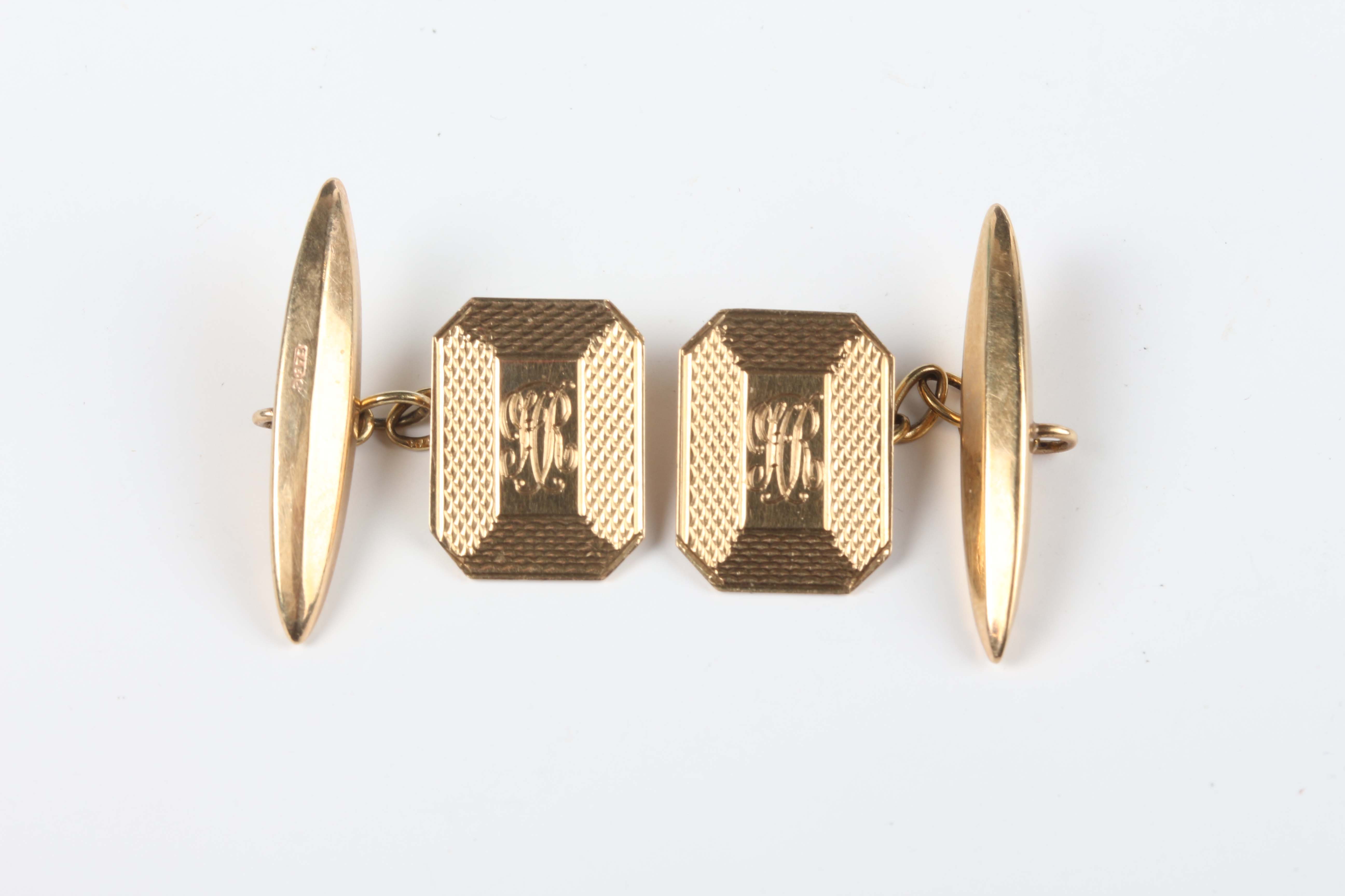 A pair of 9ct gold cufflinks with engine turned cut cornered rectangular fronts, initial engraved, and faceted torpedo shaped backs, weight 3.1g, dimensions of each front 1.4cm x 1.1cm, with a case.