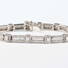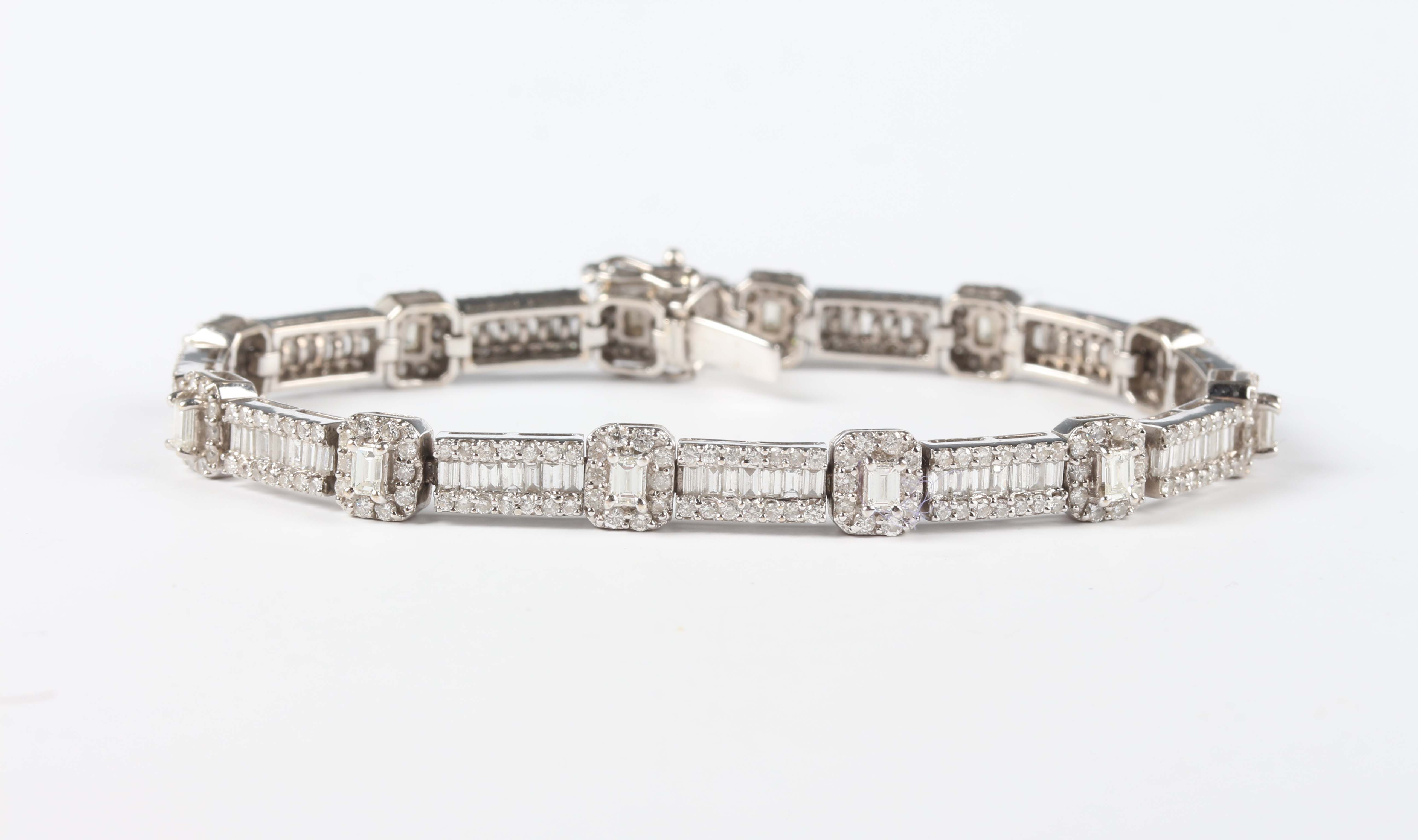 An 18ct white gold and diamond bracelet, formed as a series of alternating rectangular and smaller rectangular links, mounted with baguette and circular cut diamonds, on a snap clasp, weight 17.7g, length 18.3cm.